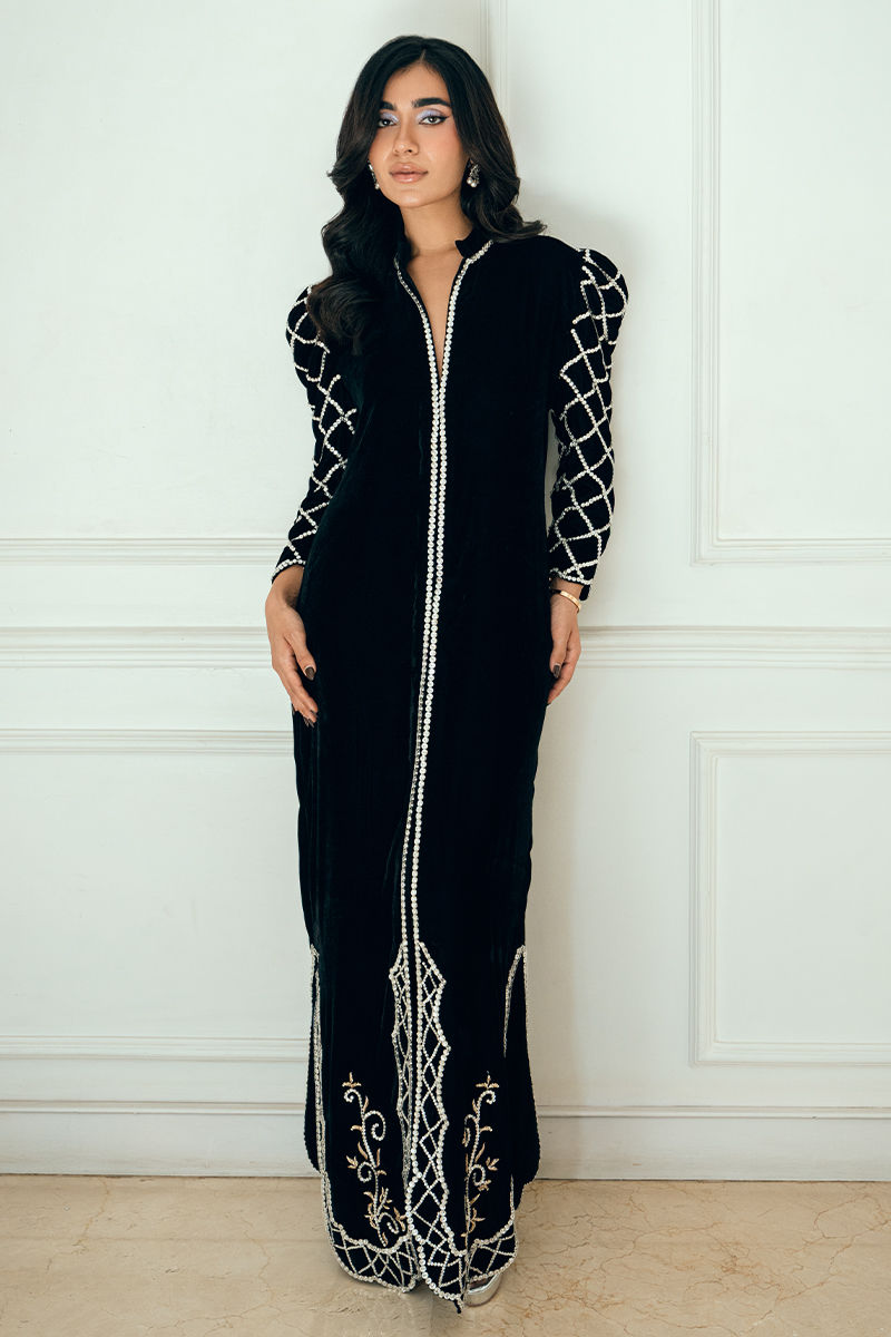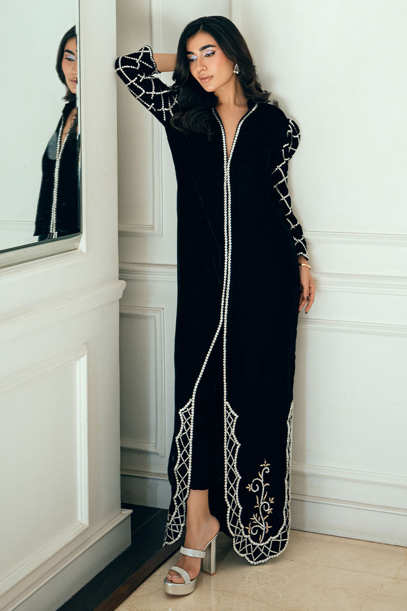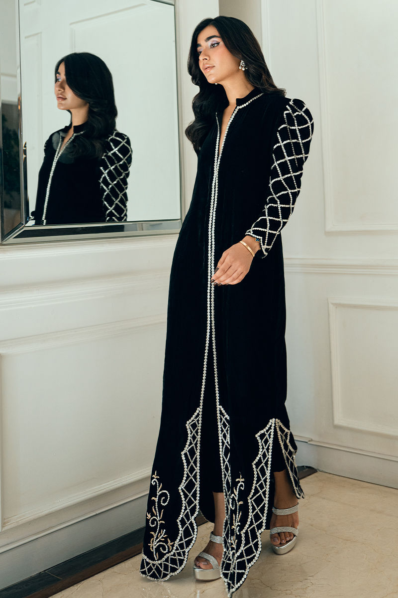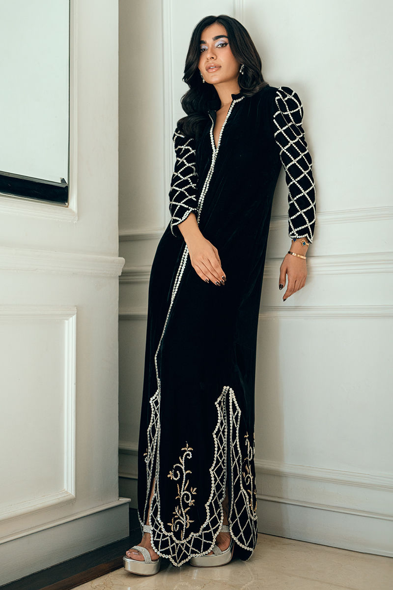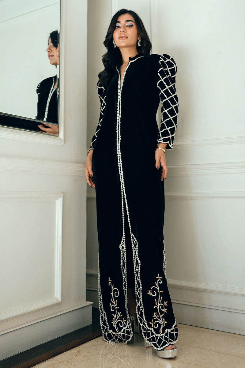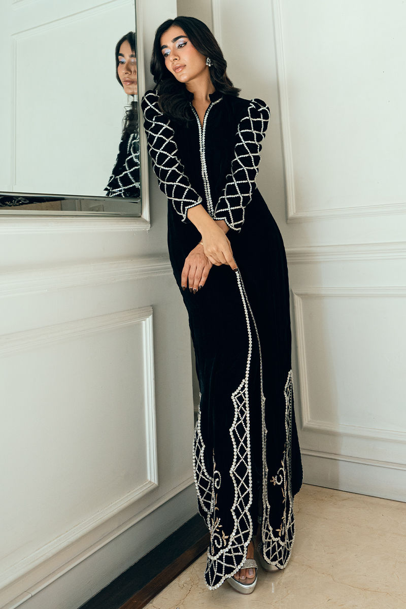Nera black velvet features dazzling diamante stone handwork on both front and back, enriched with handmade zardozi and stone bunches. Finished with fully embellished diamante sleeves for a luxe statement.