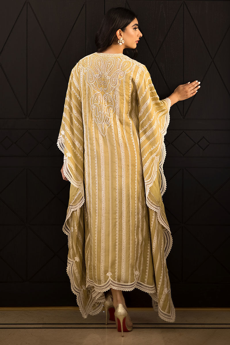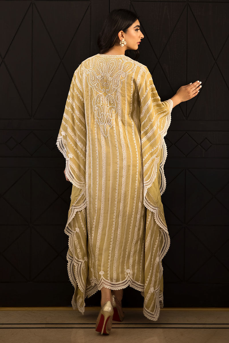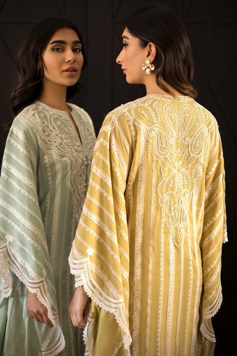 Get ready to make a stylish statement in this graceful outfit “Nisha”. A pure voil fabric with attached cotton silk lining with threadwork embroidery all over with threadwork embroidery with pearl embellishments on the front and back neckline with scalloped Applique threadwork border on the sides. This look is complemented with cotton silk pants with lace edgings.
