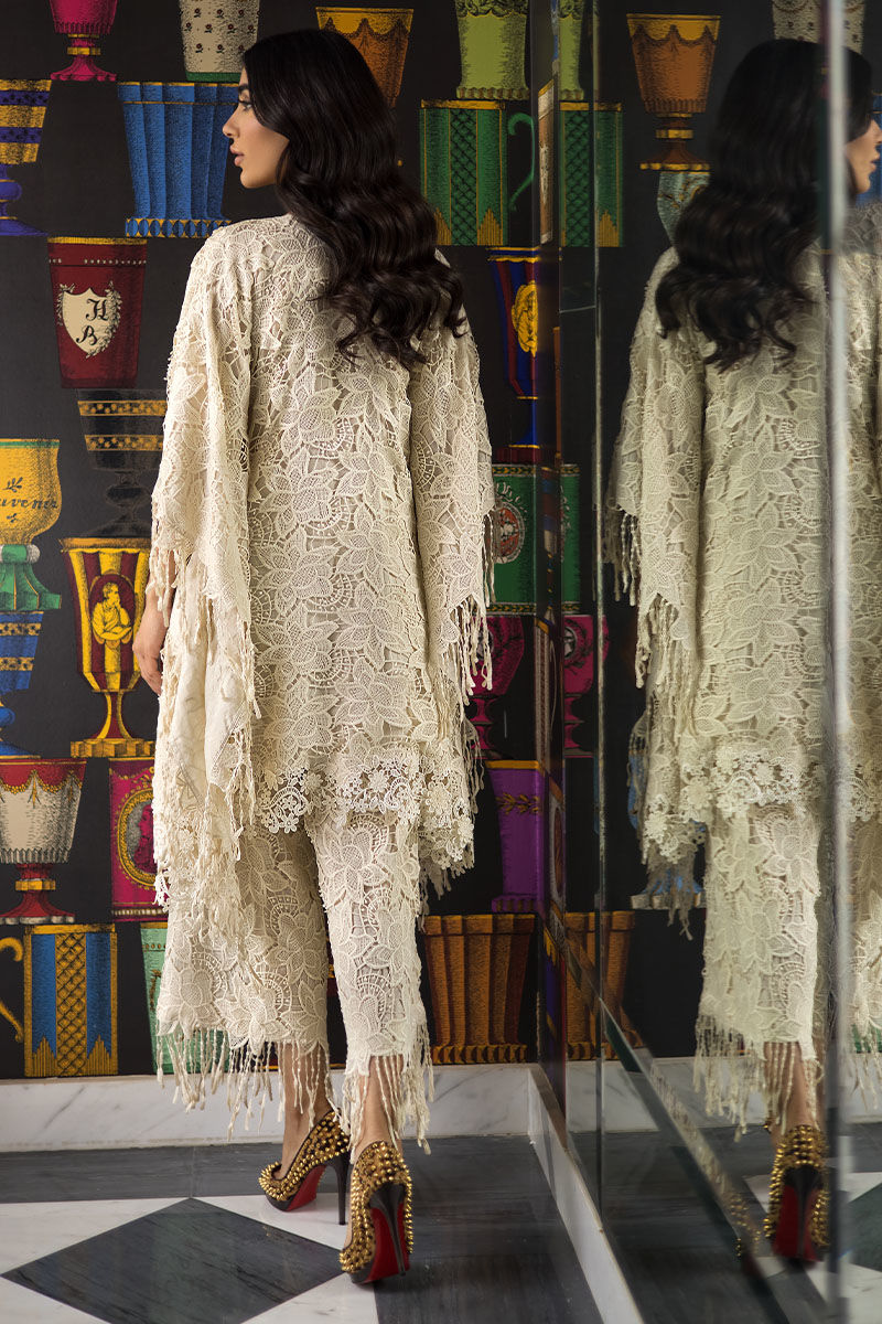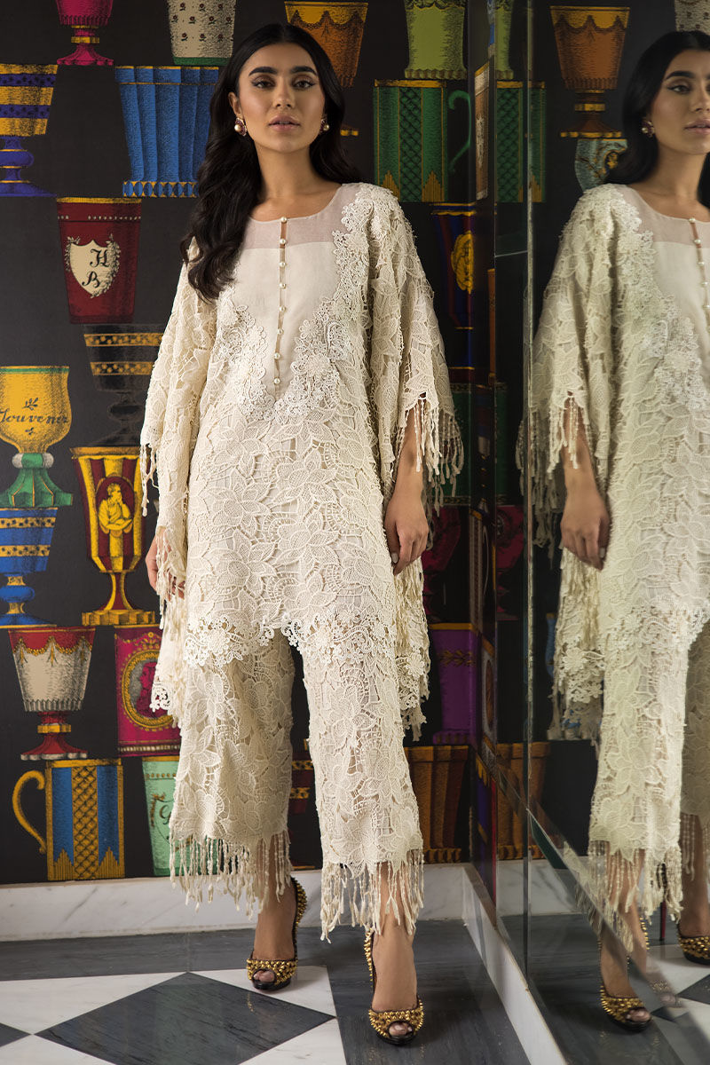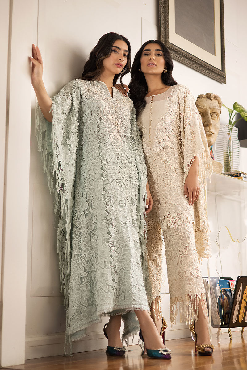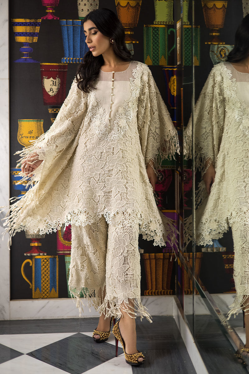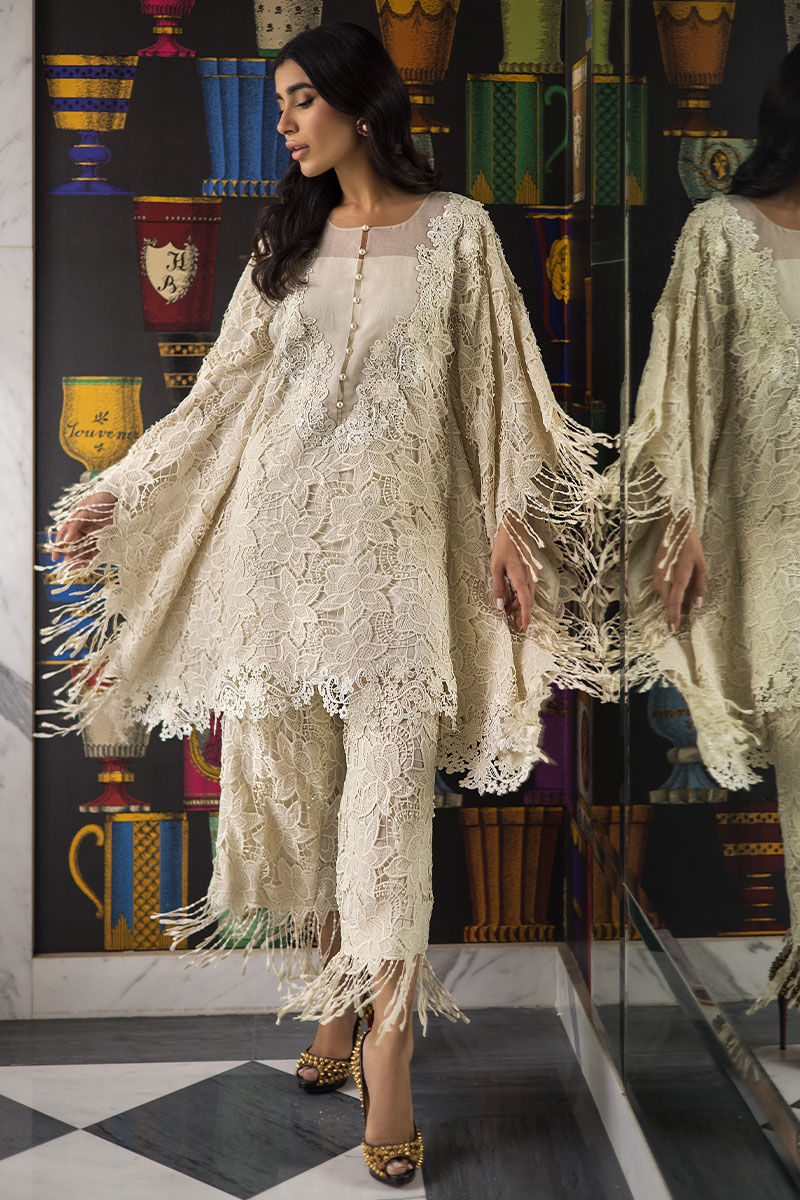 Get ready to make a stylish statement in this graceful outfit “Nissa” cutwork lace poncho with 3D floral broaches and pearl buttons on the neckline with lace cutwork pants and 3D broaches on the damaan with the front hanging on the sleeves and the culottes.