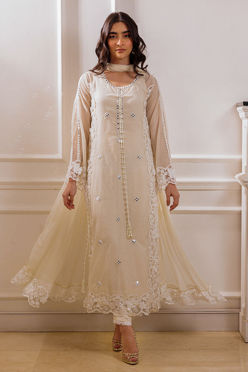 The Noreena beige cotton net shirt is adorned with exquisite mirror work and scalloped cutwork, featuring 3D appliqué cutwork borders with delicate petal detailing on the sides. Handmade pearl tassels hang gracefully from the sides, adding a touch of elegance. The separate slip and mirror work sleeves in organza with bordered detailing complete the look. The ensemble is paired with chiffon dupatta with a cutwork appliqué border and cigarette cotton silk pants for a refined finish.