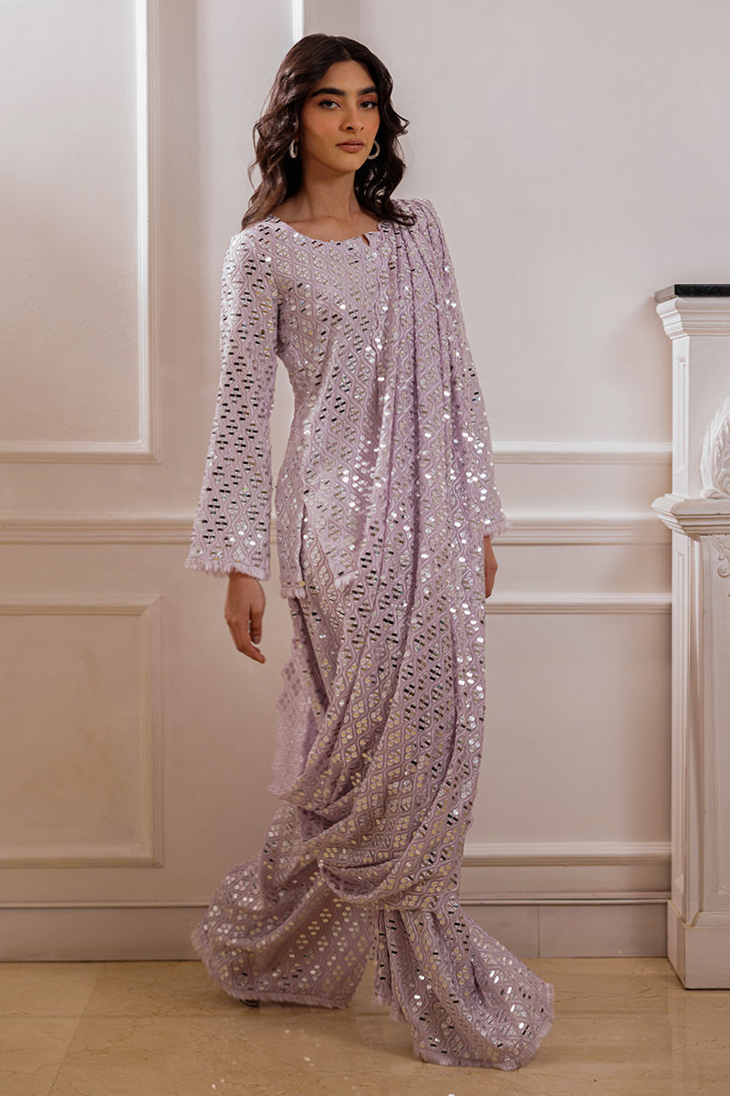 The Nyra ensemble features a lavender-hued shirt adorned with delicate thread and foil work throughout. The look is elevated with handmade thread bail detailing on the sleeves and pants. Paired with a gracefully draped stitched dupatta, designed for effortless styling, this ensemble exudes timeless elegance.