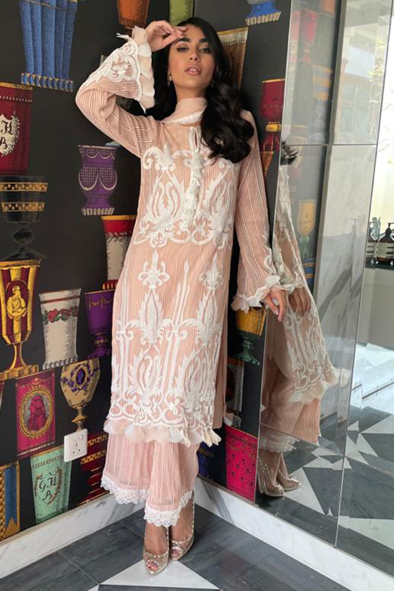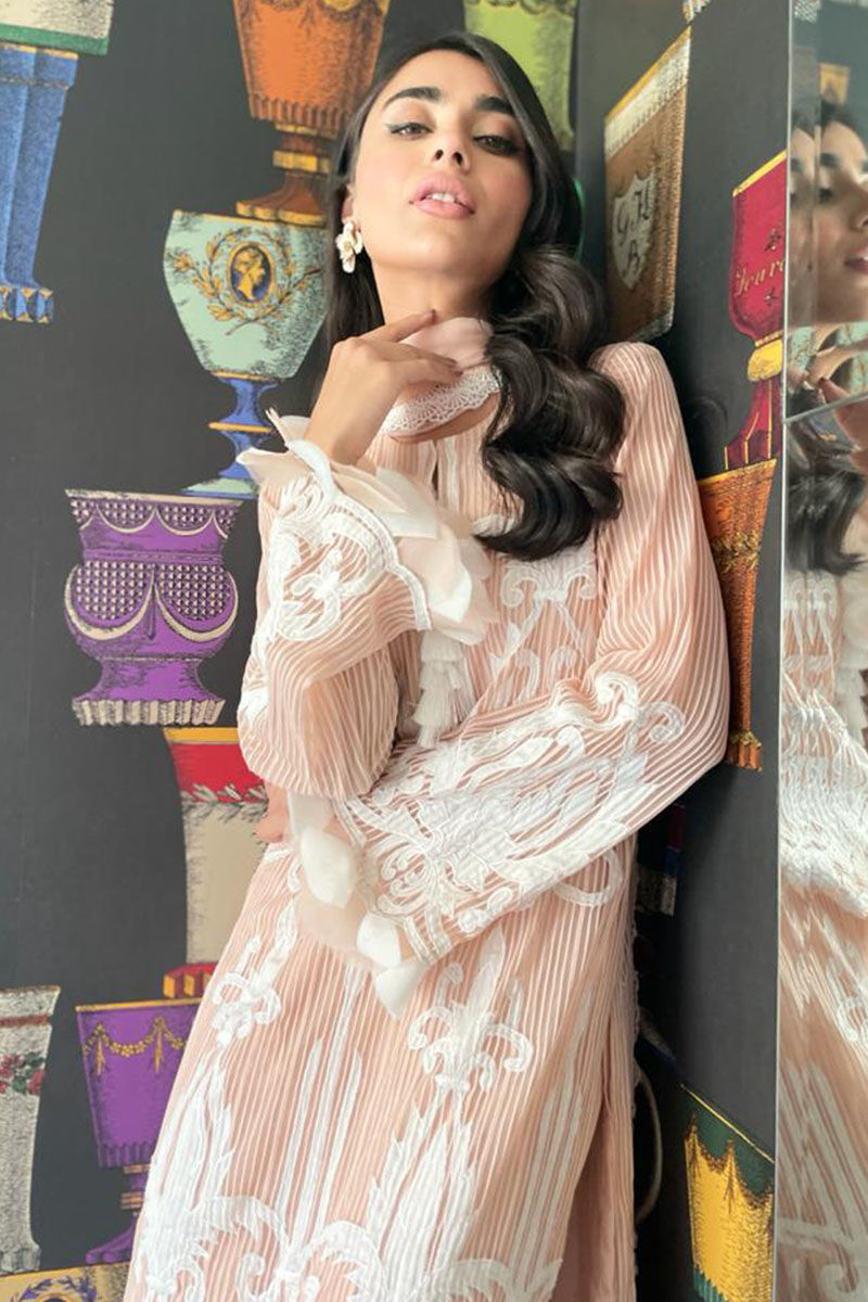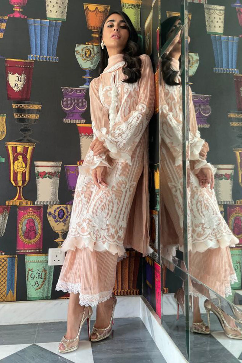 Pleated fabric with white applique machine work on shirt and sleeves and crafted tassels on the neckline and handcrafted tukris on the sleeves. Matching culottes with lace and chiffon dupatta.