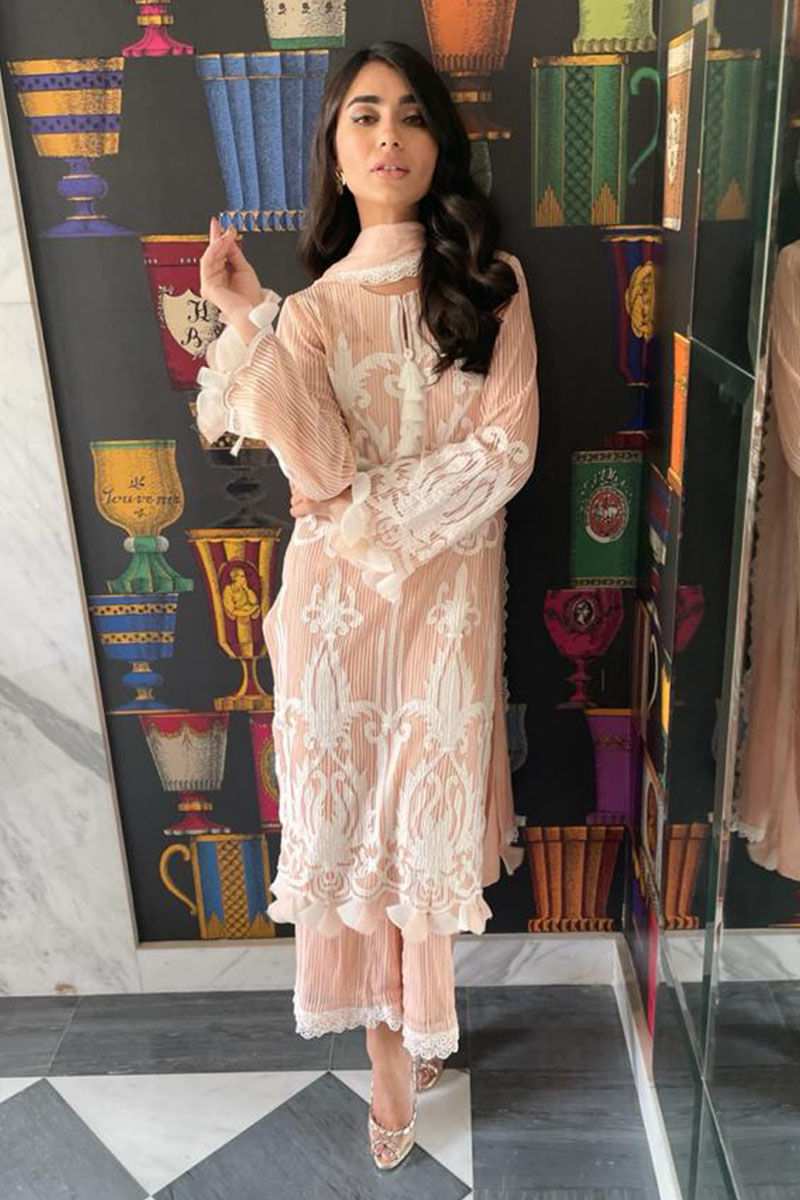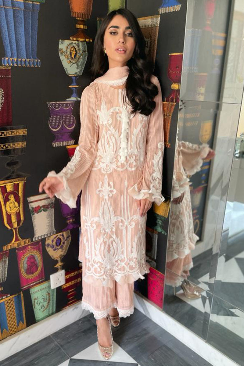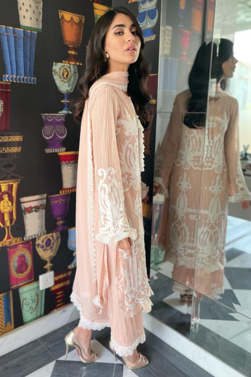 Color: Peach Fabric: Pleated Fabric Work Details: Embellished