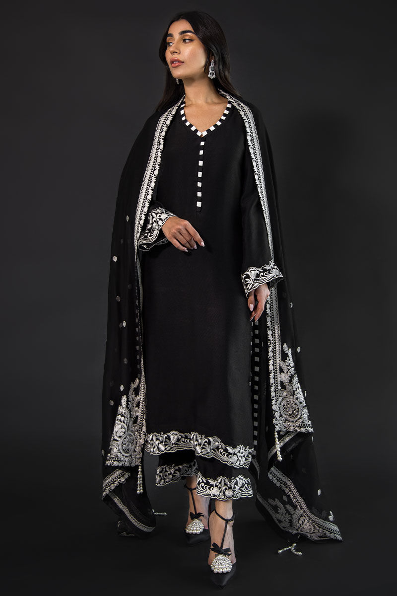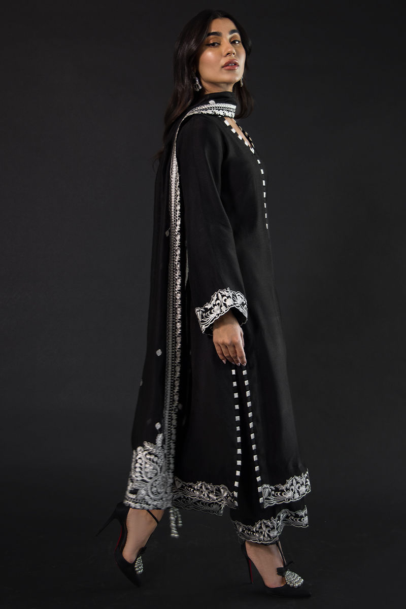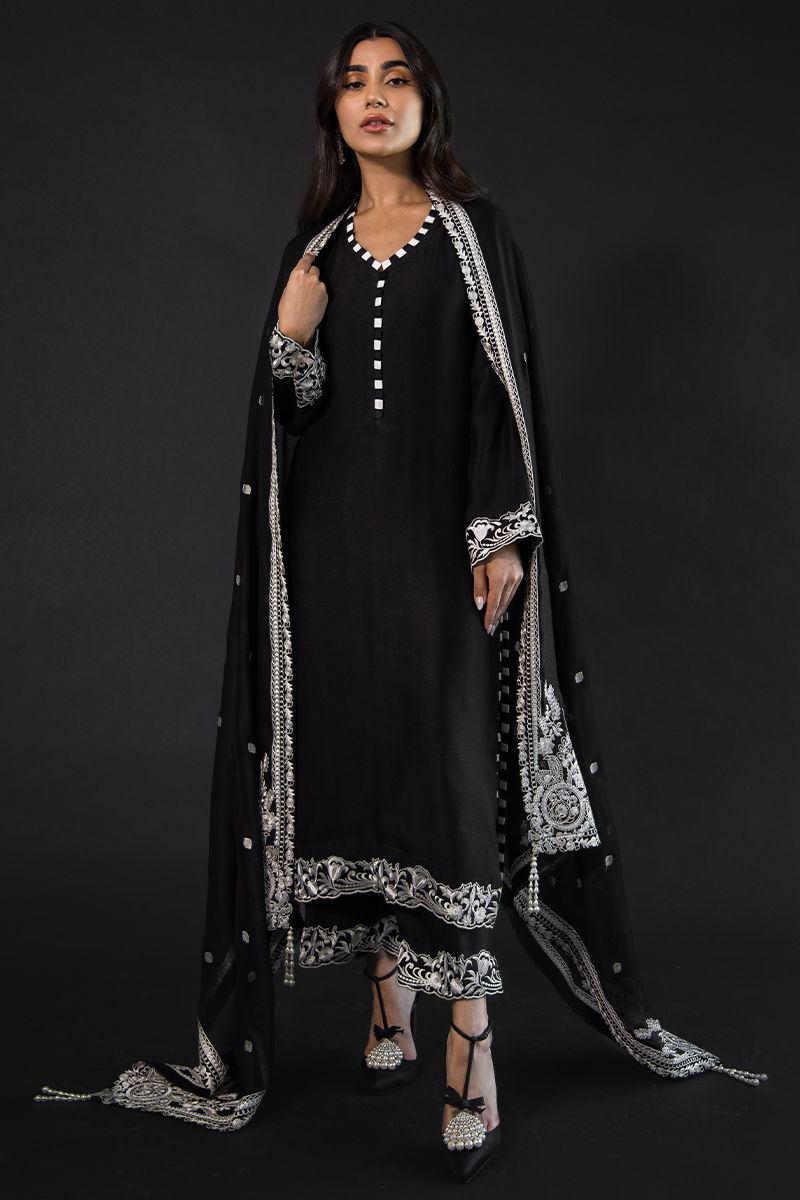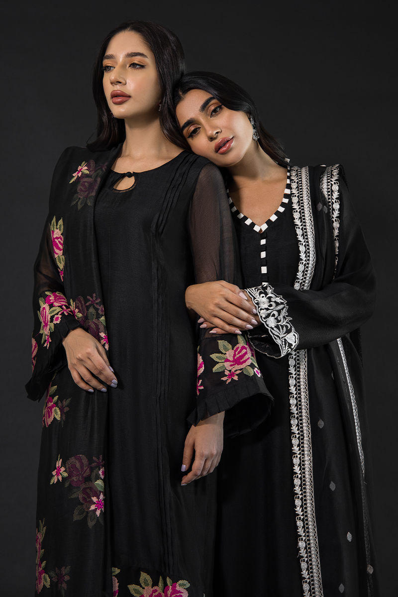 Pixie is a cotton silk net intricate attire in black-hued, adorned with enduring embroidery work on sleeves and daman. Paired with a dupatta with embroidery worked border. A glee outfit for a special event.
