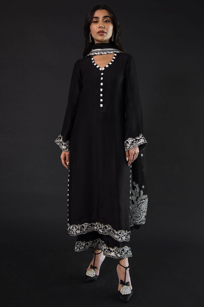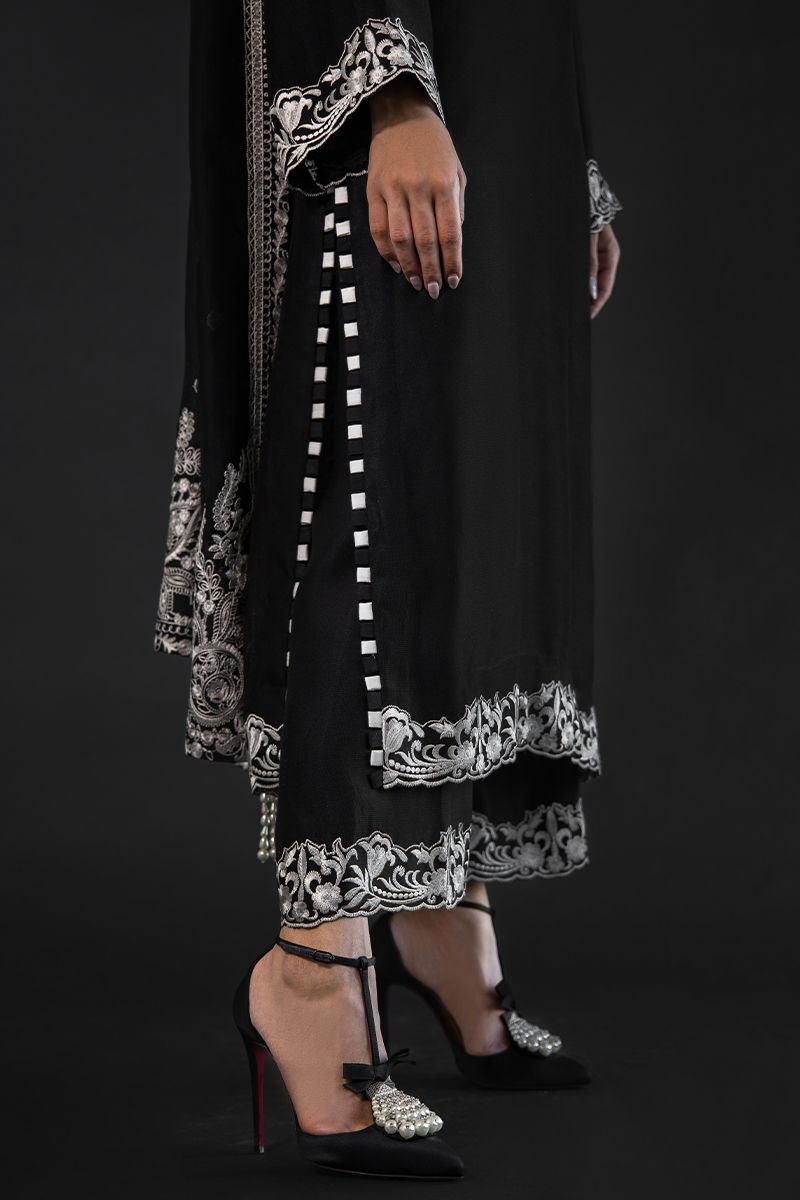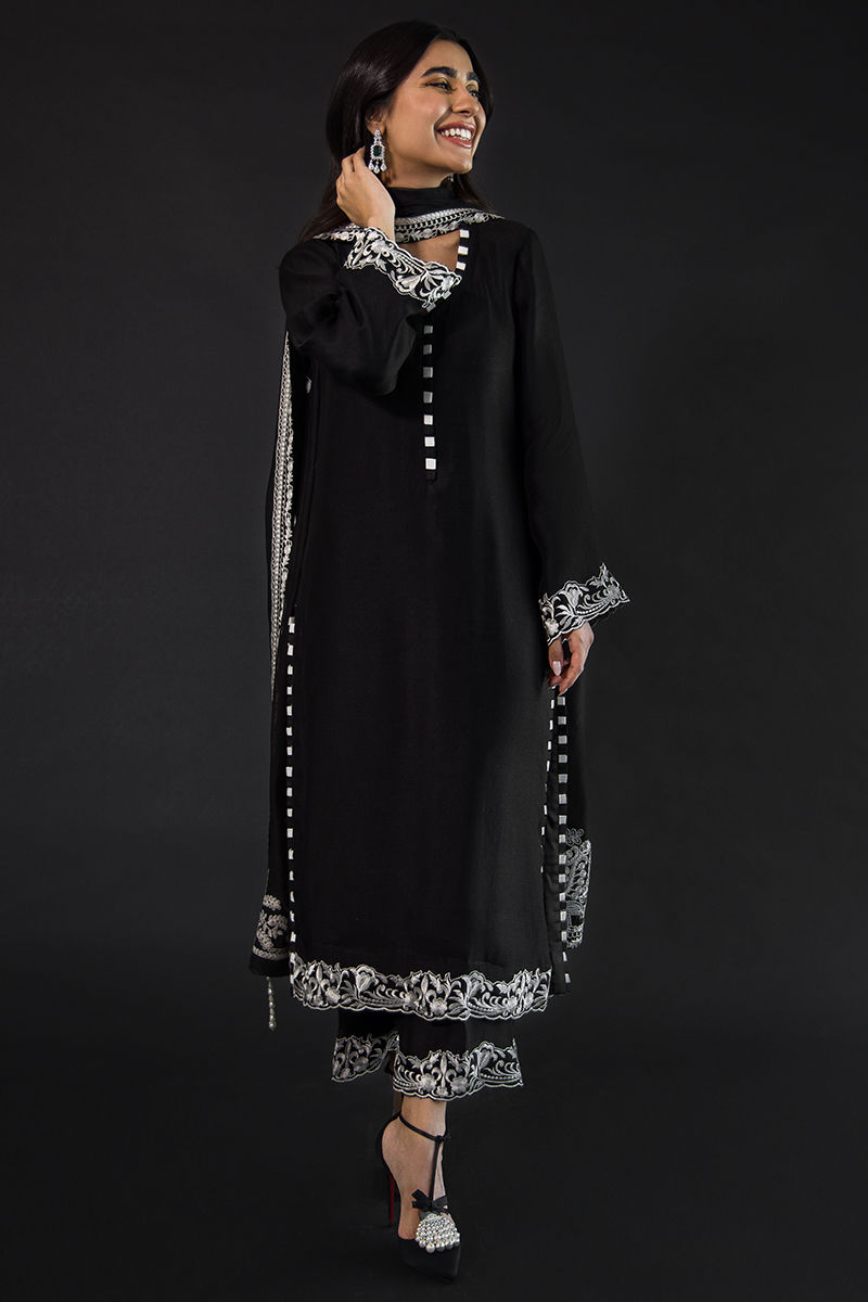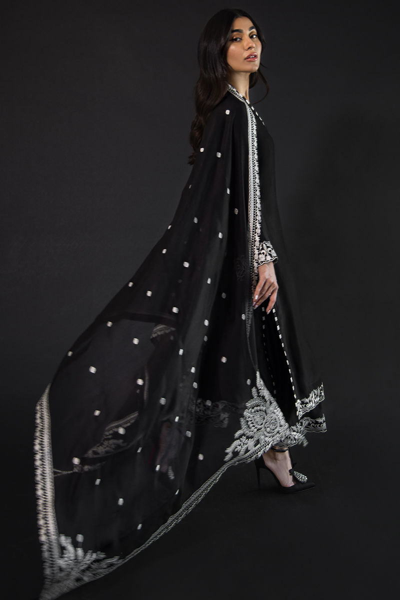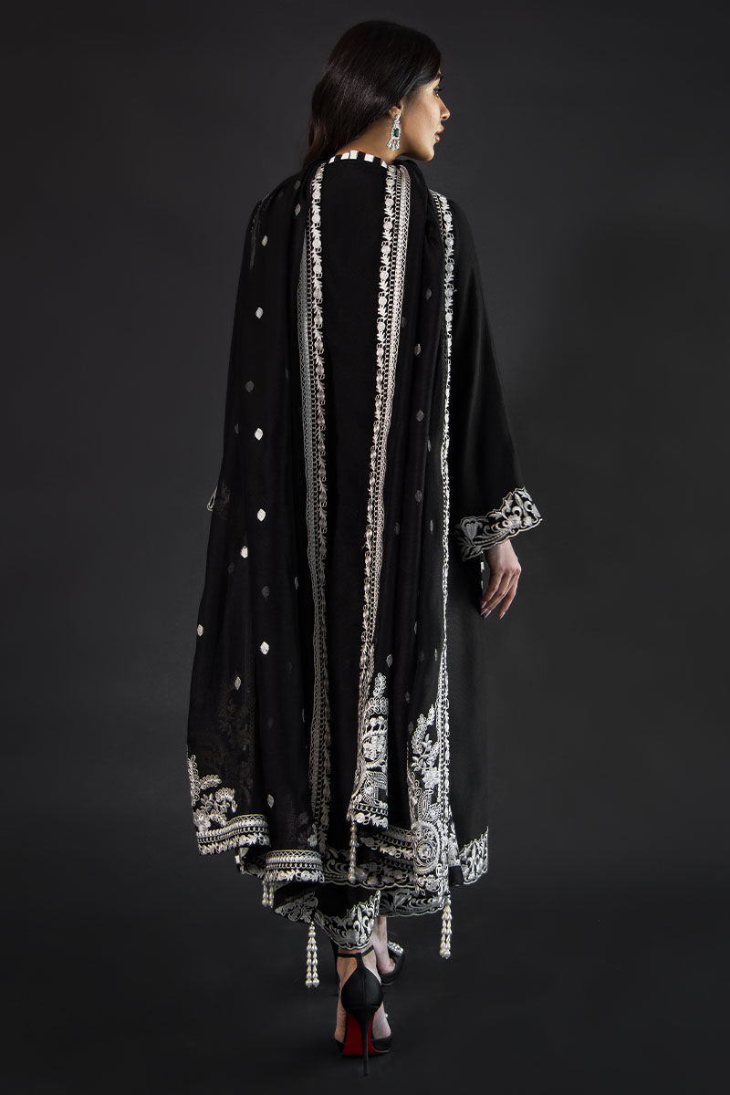 Pixie is a cotton silk net intricate attire in black-hued, adorned with enduring embroidery work on sleeves and daman. Paired with a dupatta with embroidery worked border. A glee outfit for a special event.