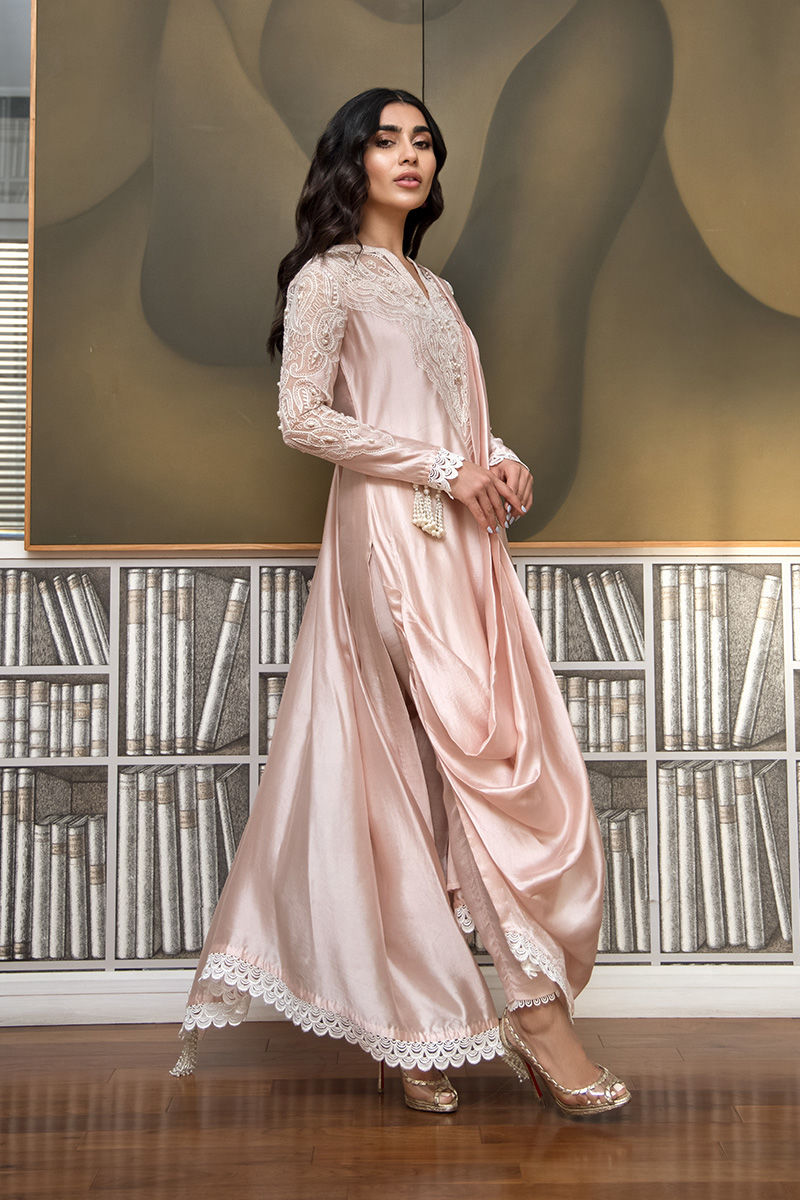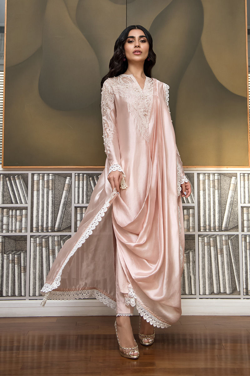 A gorgeous take on our signature Gris design, the Primrose is made from pure rich silk with intricate thread embroidery on the front neckline, sleeves and back with handmade pearl embellishments and pearl danglings. Comes with attached cotton silk lining, and cotton silk cigarette pants with lace finishing.
