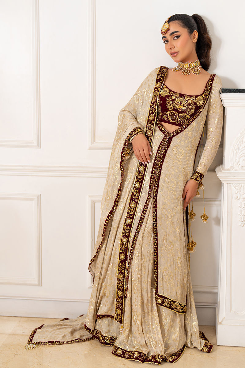 Color: Ivory Gold Fabric: Gorgette Chiffon Work Details: Sequin And Zardozi
