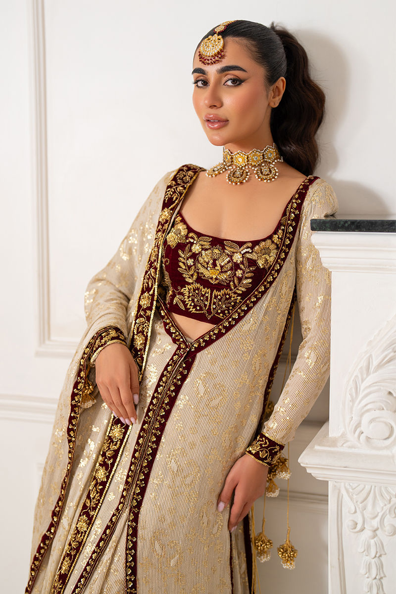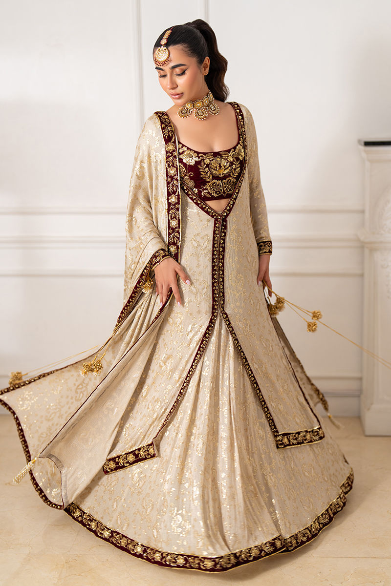 Discover the allure of this georgette chiffon floral sequin jacket, complemented by handmade zardozi borders. Paired with a rich maroon velvet choli featuring zardozi detailing on the sleeves, and an intricately adorned lengha, dupatta, and shirt. An ensemble of exquisite craftsmanship and elegance.