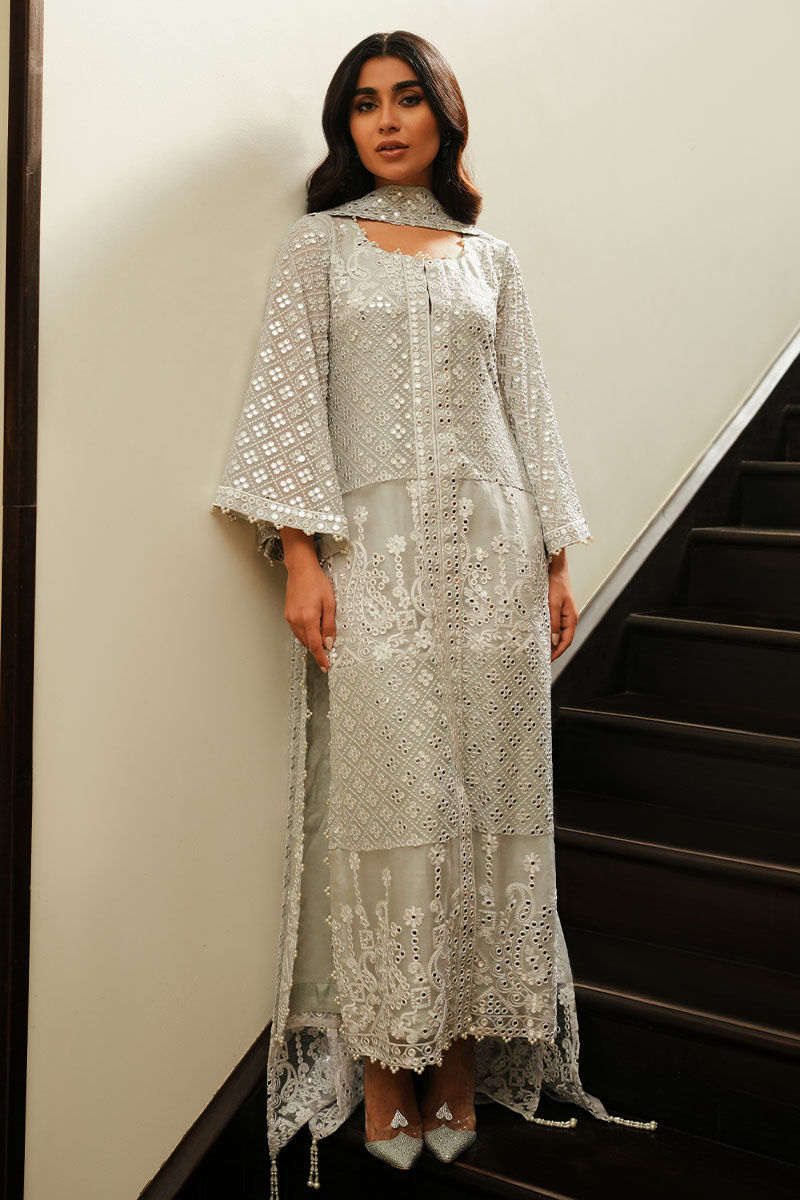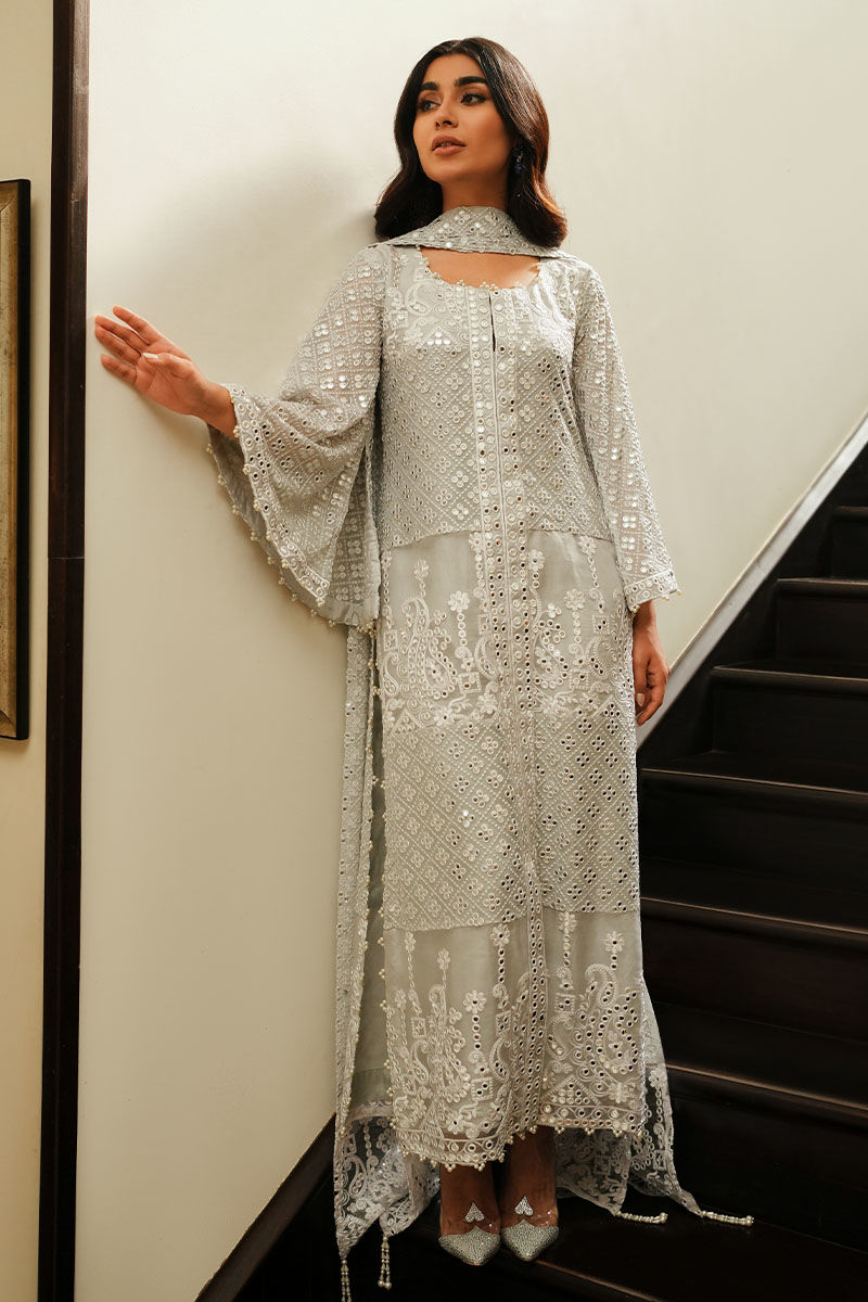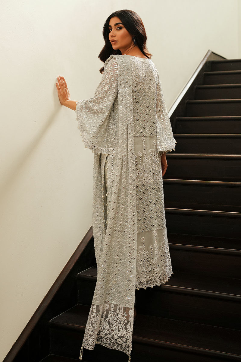 Embrace sophistication in a grey georgette chiffon jacket, adorned with exquisite foil and thread work, highlighted by pure organza details and diverse borders. Pearls delicately embellish the sleeves, while stylish slits add a modern flair to your ensemble.