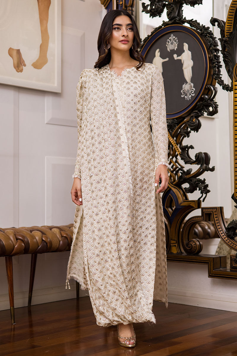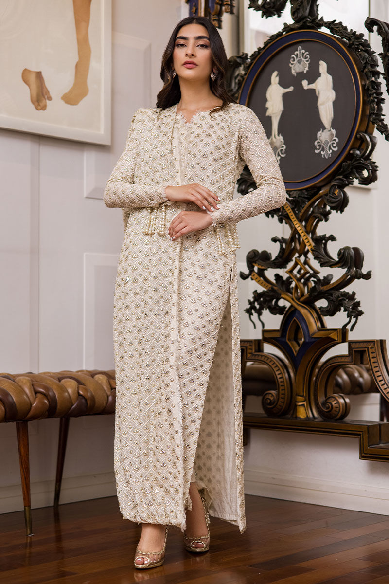 Reyna outfit is a true embodiment of luxury and elegance. The pure georgette chiffon fabric drapes beautifully, while the silver foil work embroidery botis all over the shirt add a touch of glamour and sophistication. The attached Dupatta and handmade pearl tassels on the sleeves are stunning details that complement the intricate handmade threadwork bail on the front. The cotton silk chalks and sleeves provide a comfortable fit, and the cigarette pants add a modern twist to this classic ensemble. Reyna is the perfect outfit for any special occasion, where you want to exude grace and style.