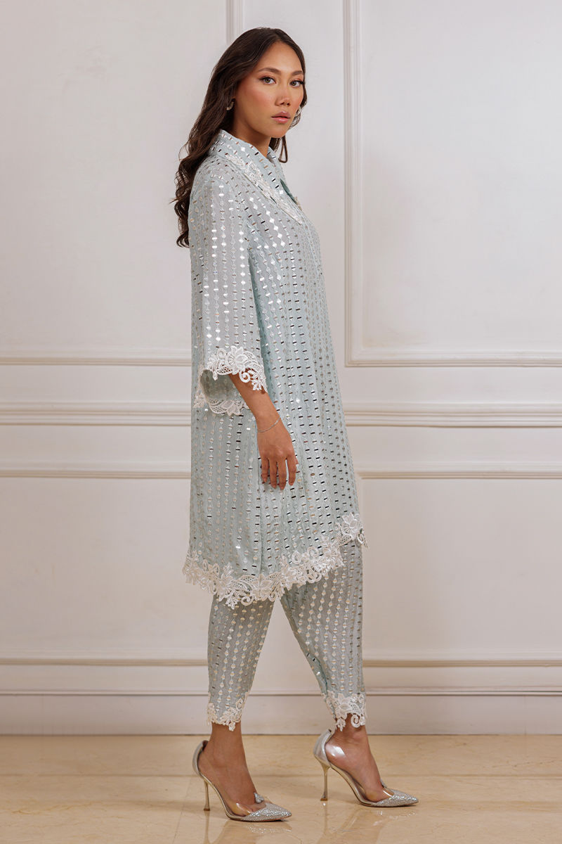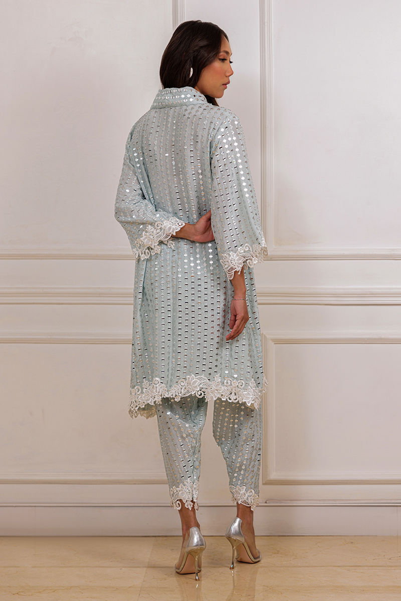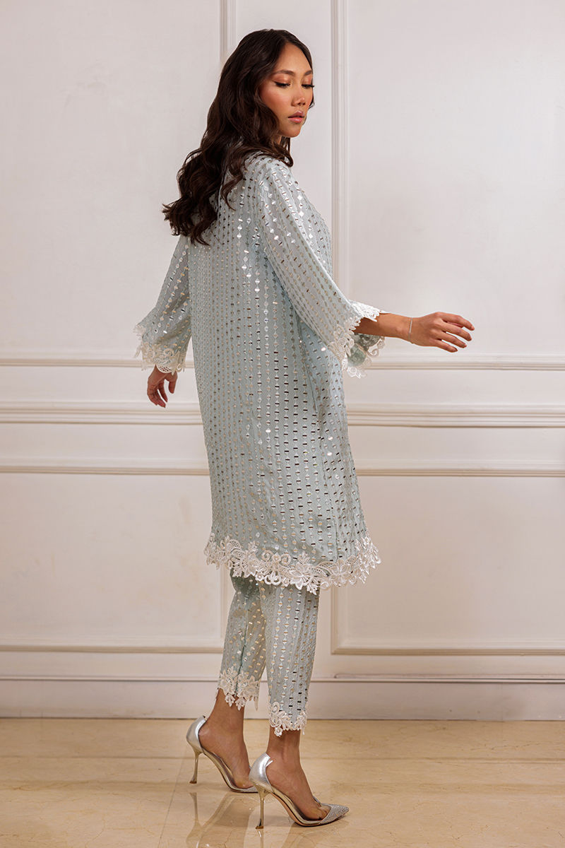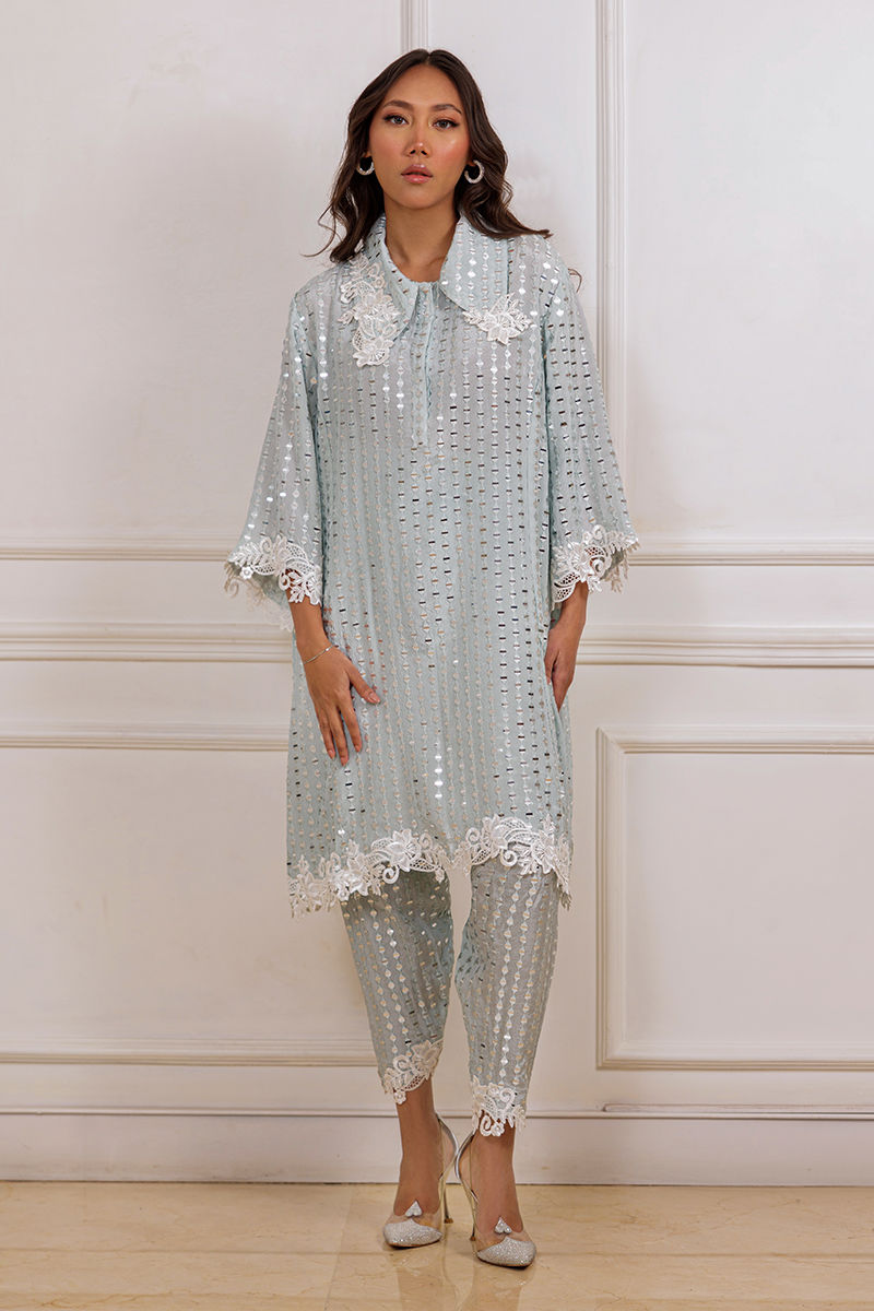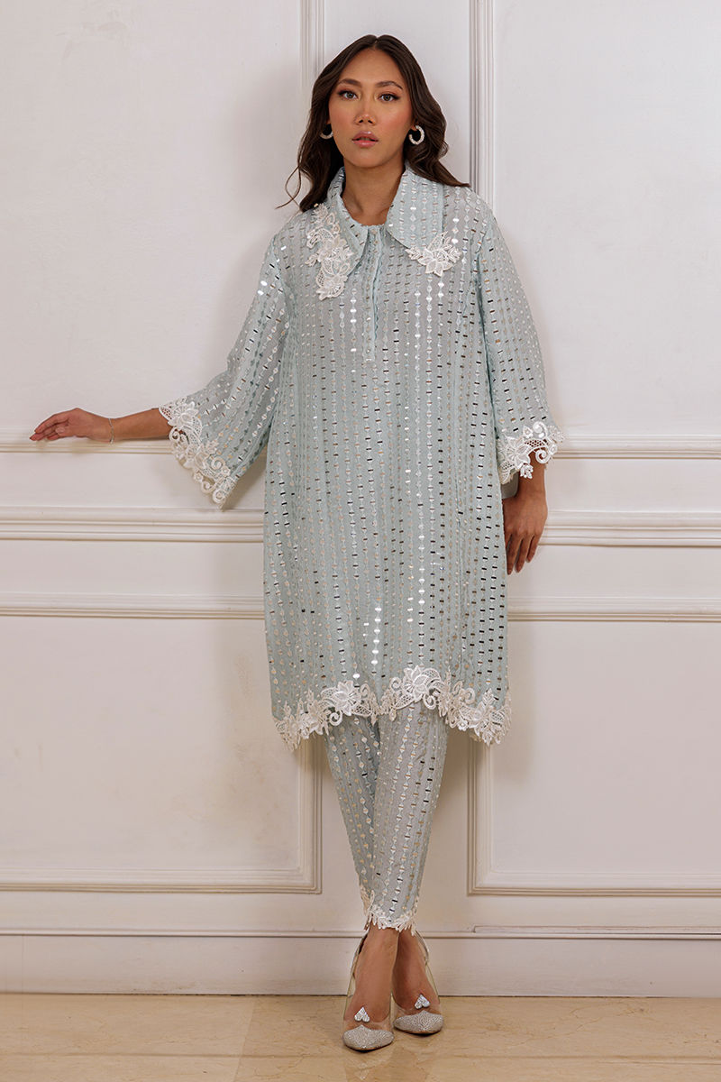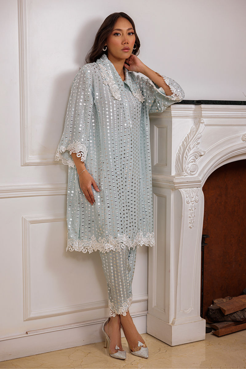 The Roha ensemble features a stunning bluish-green silk shirt and pants, adorned with intricate thread and foil work. 3D appliqué cutwork florals embellish the daman, sleeves, collar of the shirt, and the shalwar, adding a touch of sophistication. The shirt offers a relaxed fit, suitable for XS, S, and M sizes.