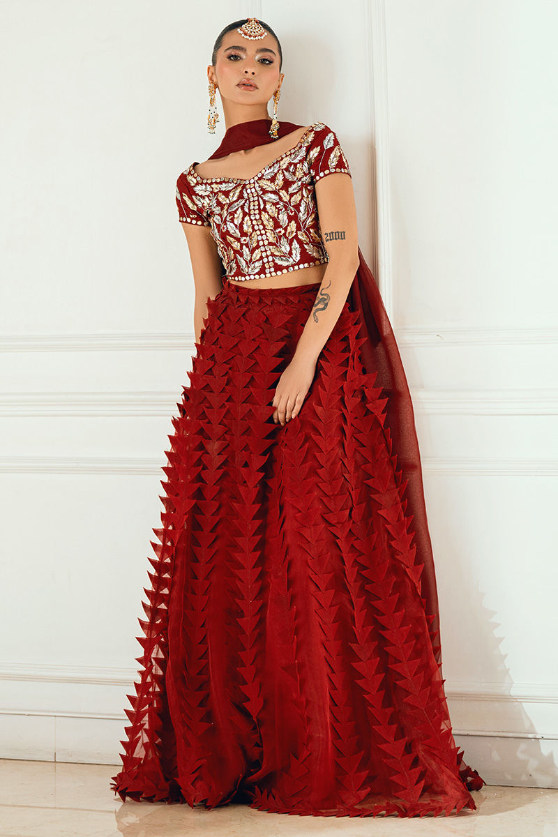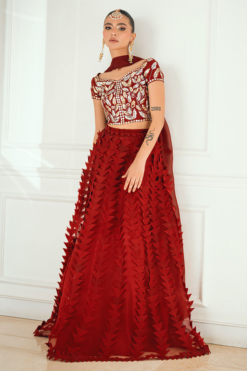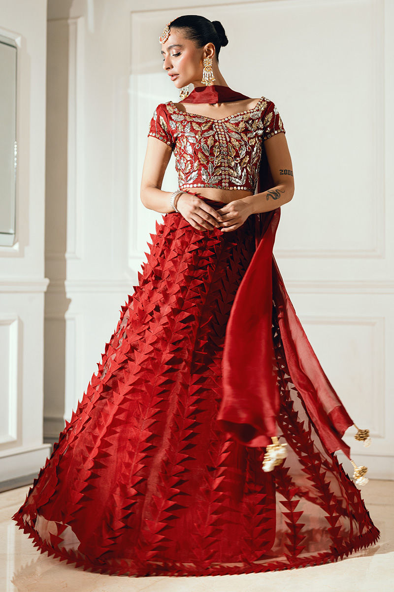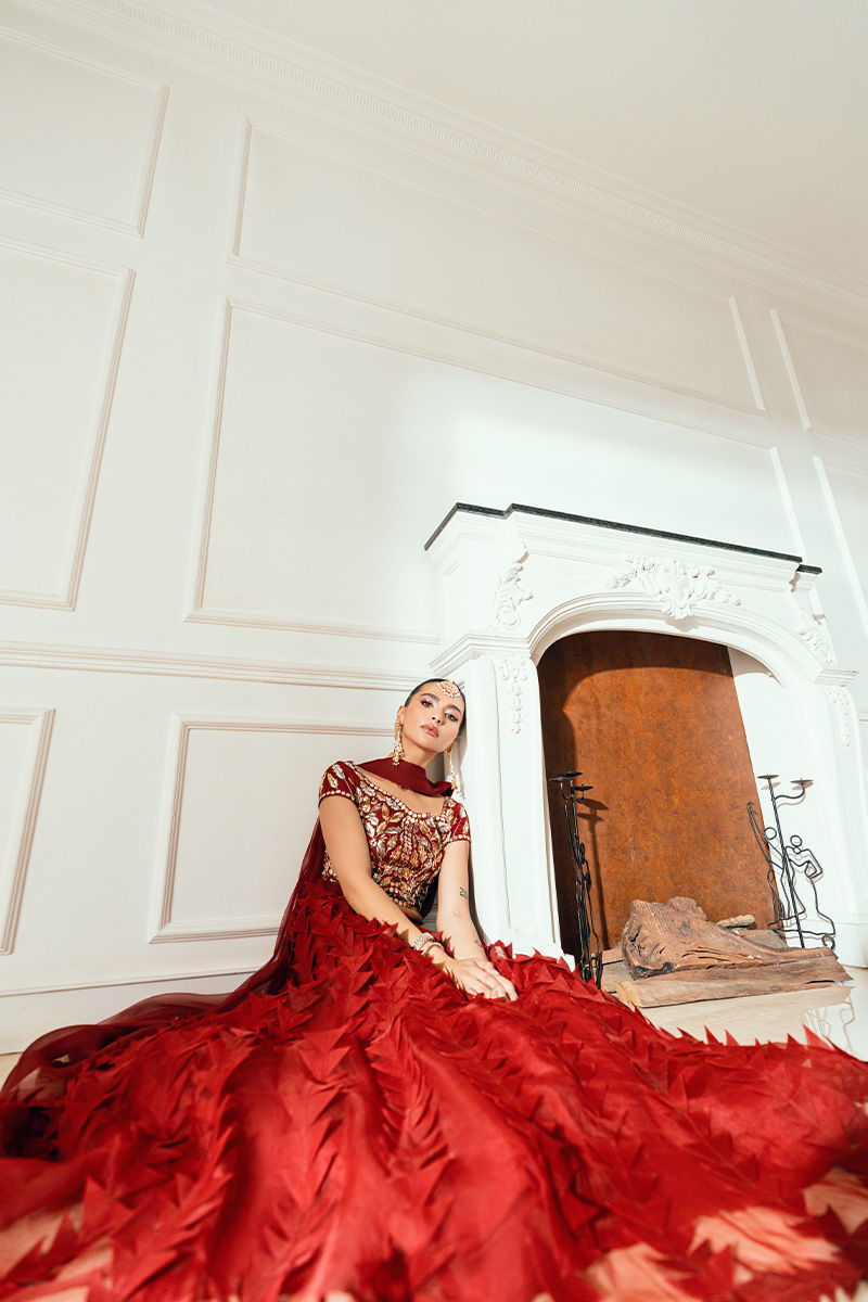 Safi is a striking red pure organza lehnga choli set that embodies timeless craftsmanship and regal charm. The choli is adorned with intricate handworked Kamdani in silver and gold, creating a luminous appeal. The lehnga is detailed with exquisite handmade tukris of pure organza throughout and enhanced with a graceful kankan finish for added volume and flow.