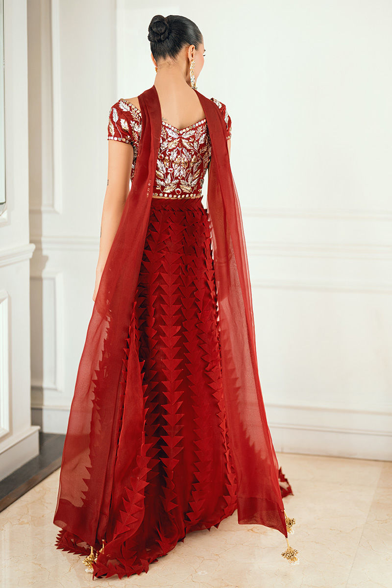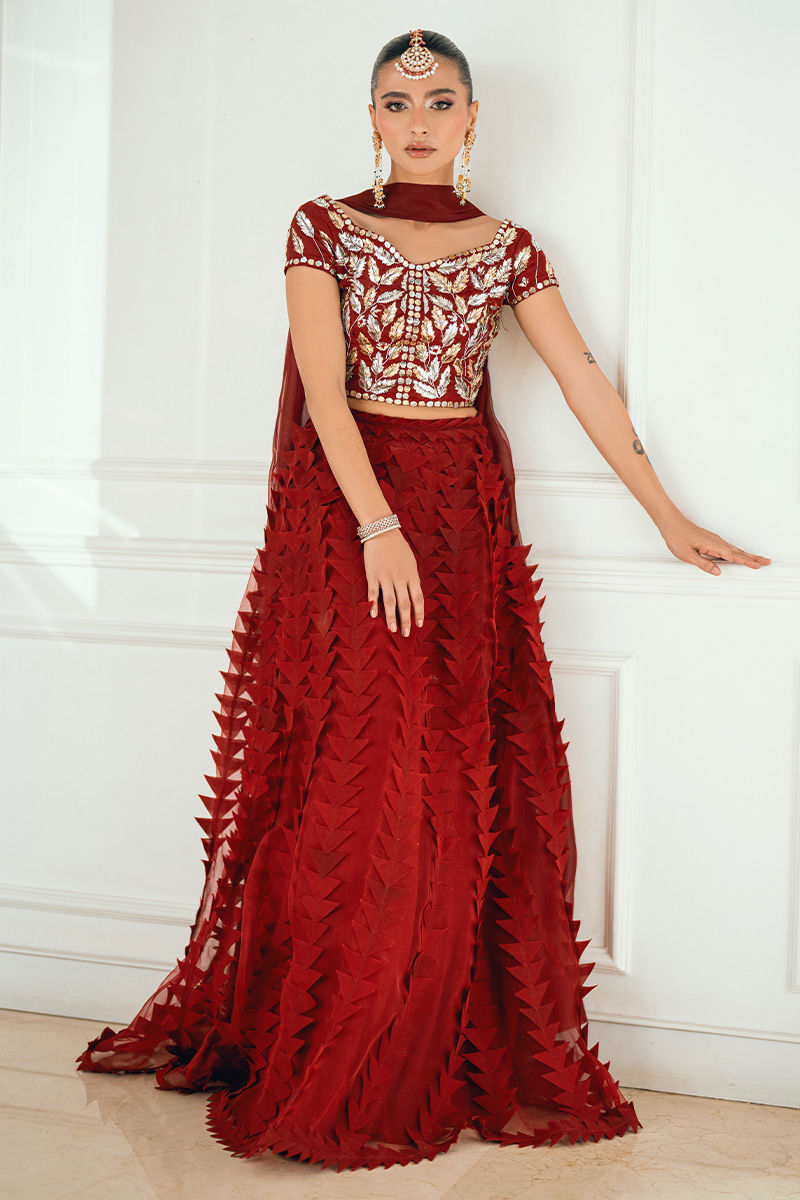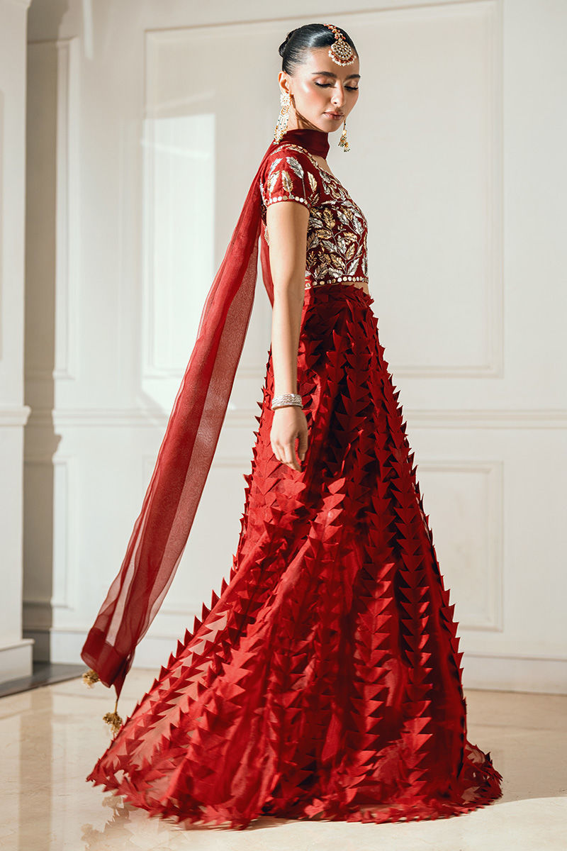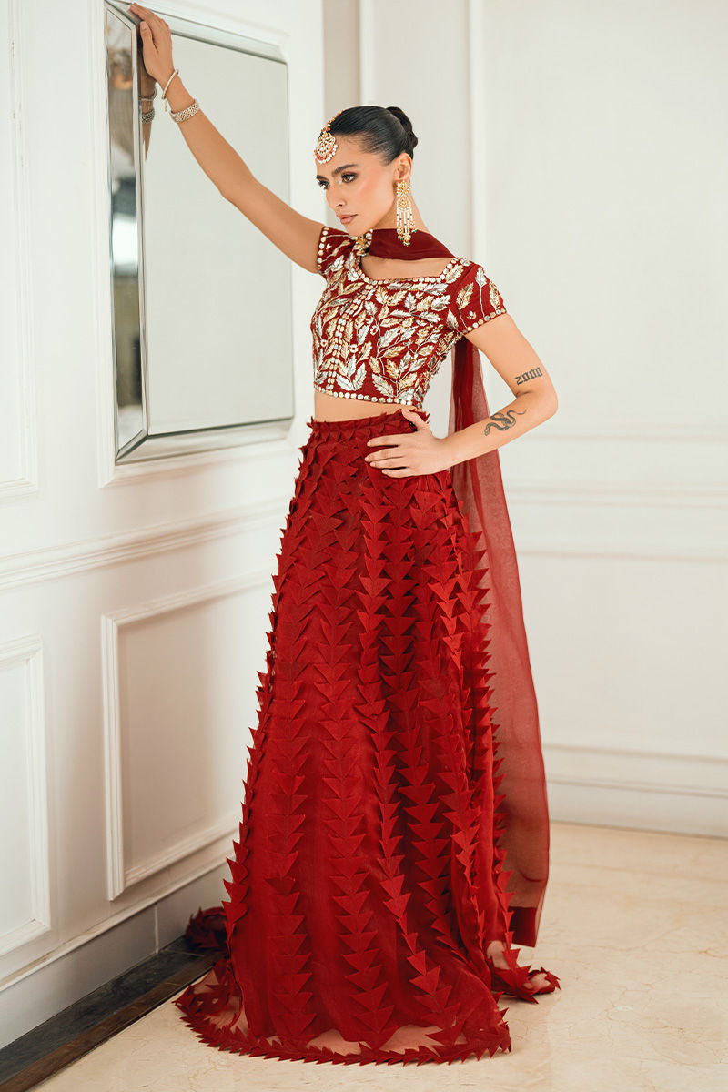 Safi is a striking red pure organza lehnga choli set that embodies timeless craftsmanship and regal charm. The choli is adorned with intricate handworked Kamdani in silver and gold, creating a luminous appeal. The lehnga is detailed with exquisite handmade tukris of pure organza throughout and enhanced with a graceful kankan finish for added volume and flow.