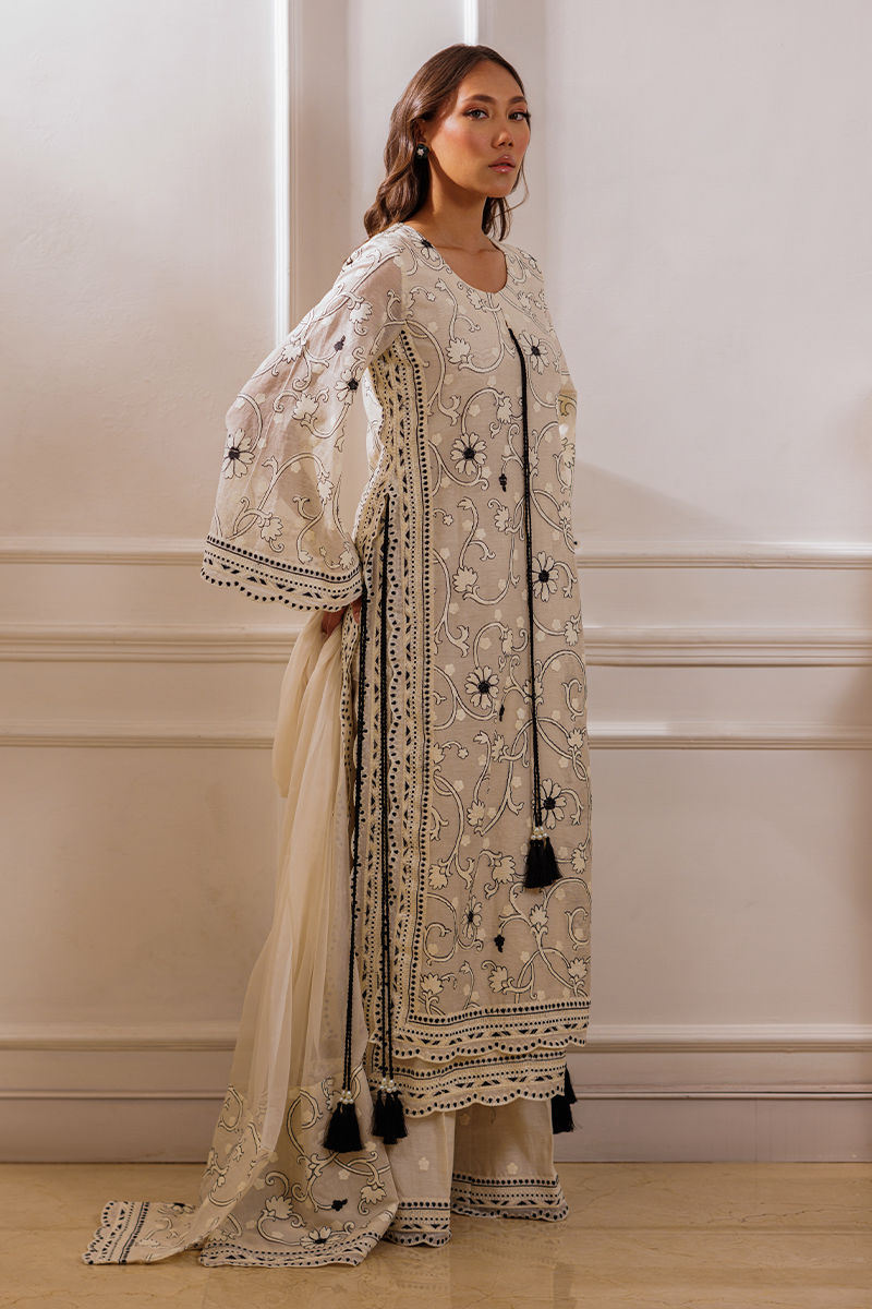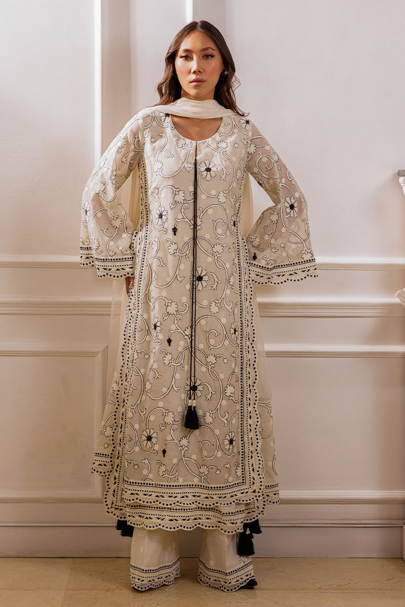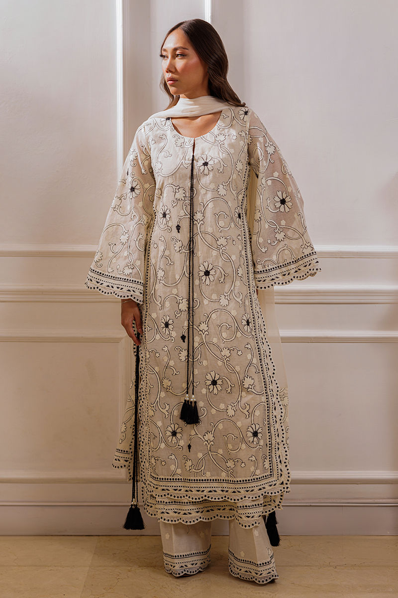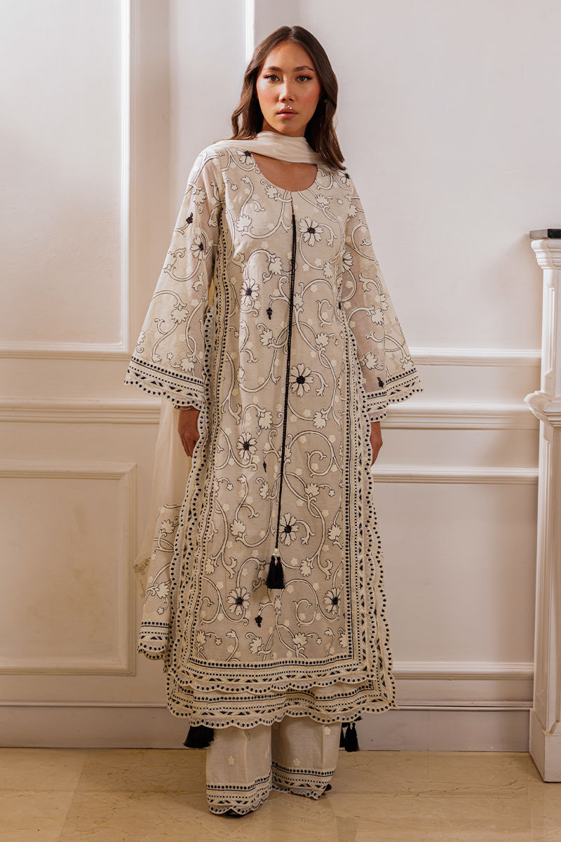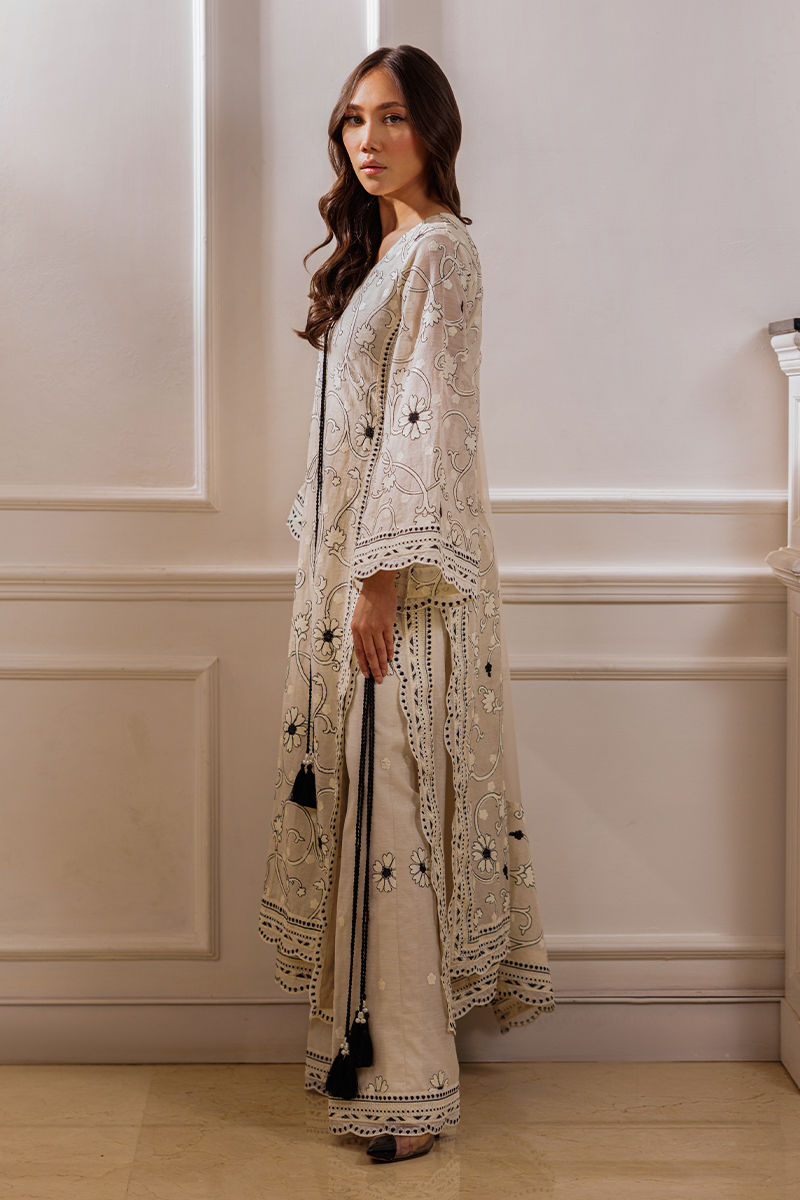The ensemble features an ivory long shirt adorned with intricate embroidery throughout, enhanced by double-layered thread borders on the sides and daman with delicate scalloped detailing. Handmade thread tassels with pearl embellishments add a refined touch. It is paired with cotton silk palazzos featuring a complementing border, creating an effortlessly elegant look.
