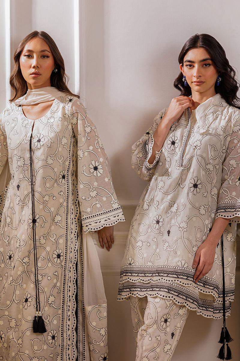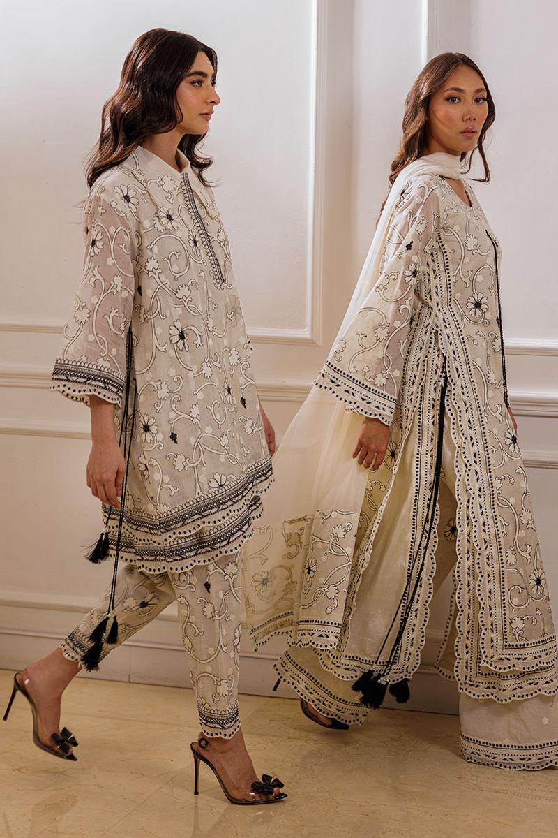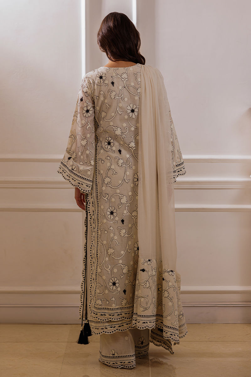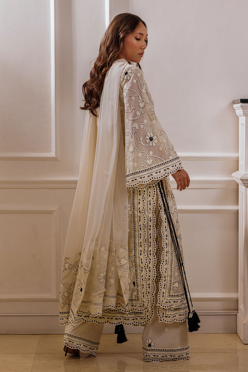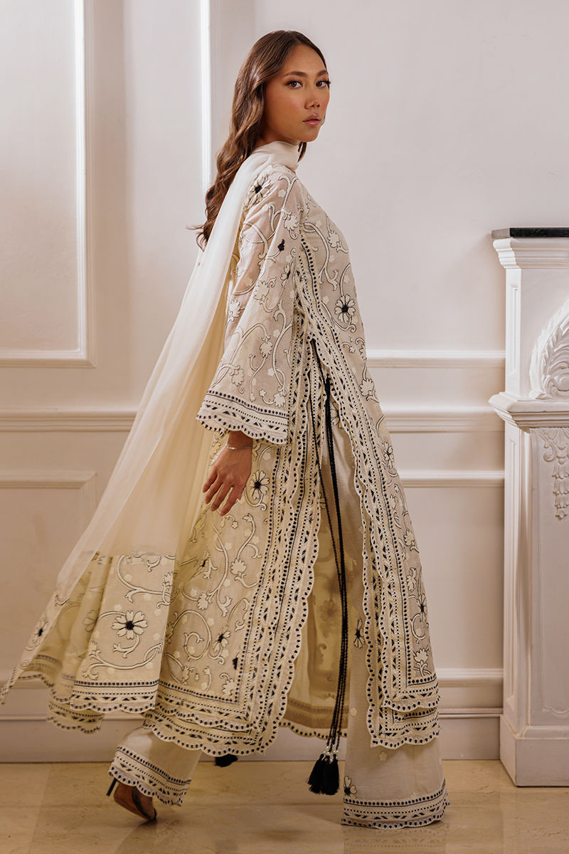 The ensemble features an ivory long shirt adorned with intricate embroidery throughout, enhanced by double-layered thread borders on the sides and daman with delicate scalloped detailing. Handmade thread tassels with pearl embellishments add a refined touch. It is paired with cotton silk palazzos featuring a complementing border, creating an effortlessly elegant look.