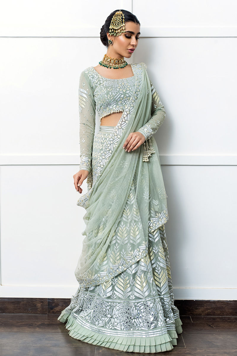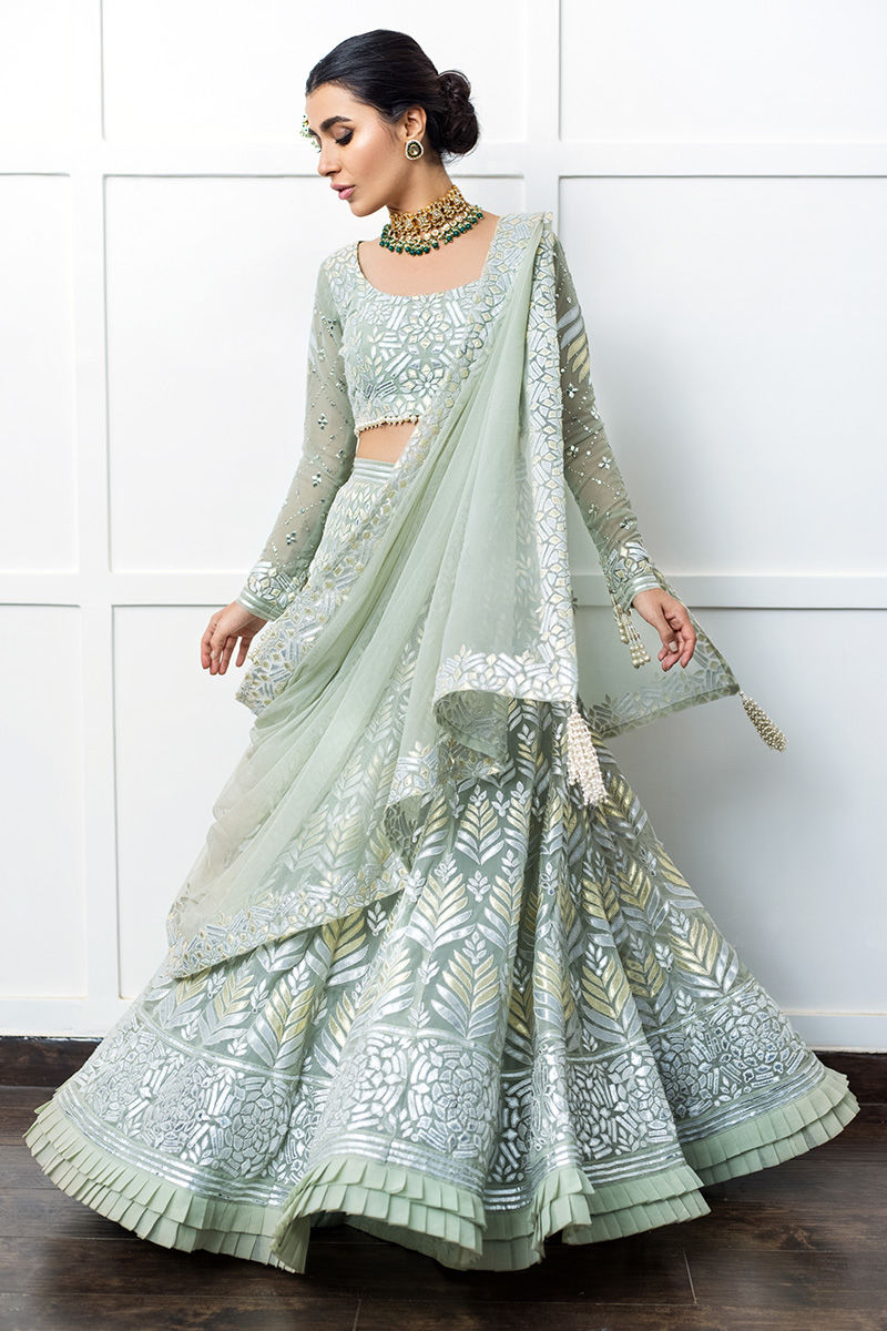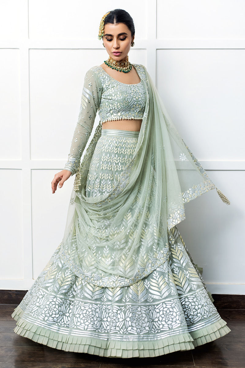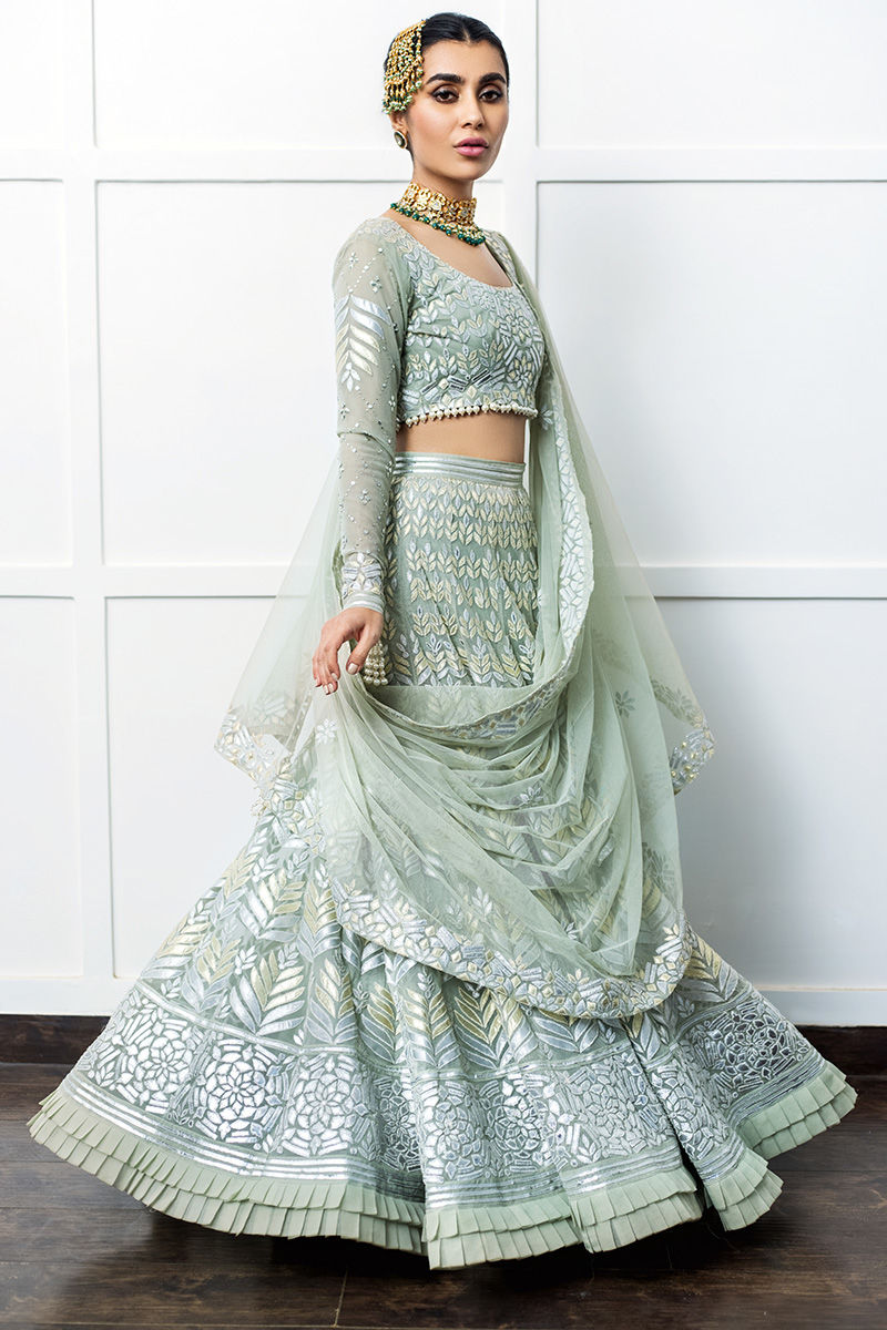 A timeless ensemble sure to make you fall in love. This pastel hued net lengha choli and dupatta features intricate cutwork gota all over in shades of silver and gold along with kaamdani work on the sleeves and handcrafted tassels and brooches.