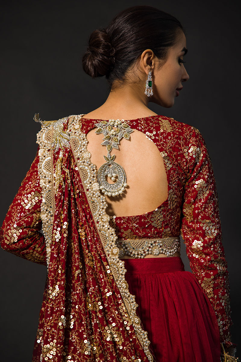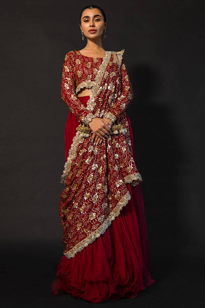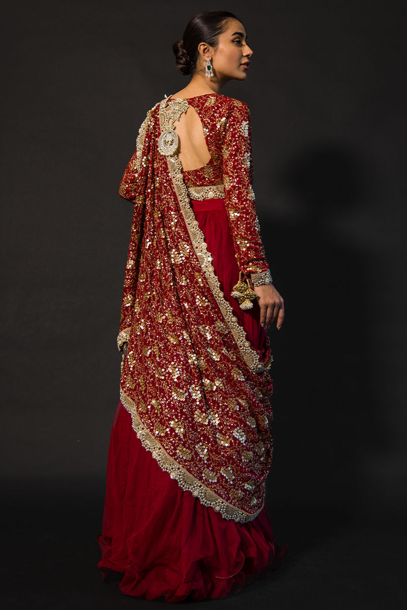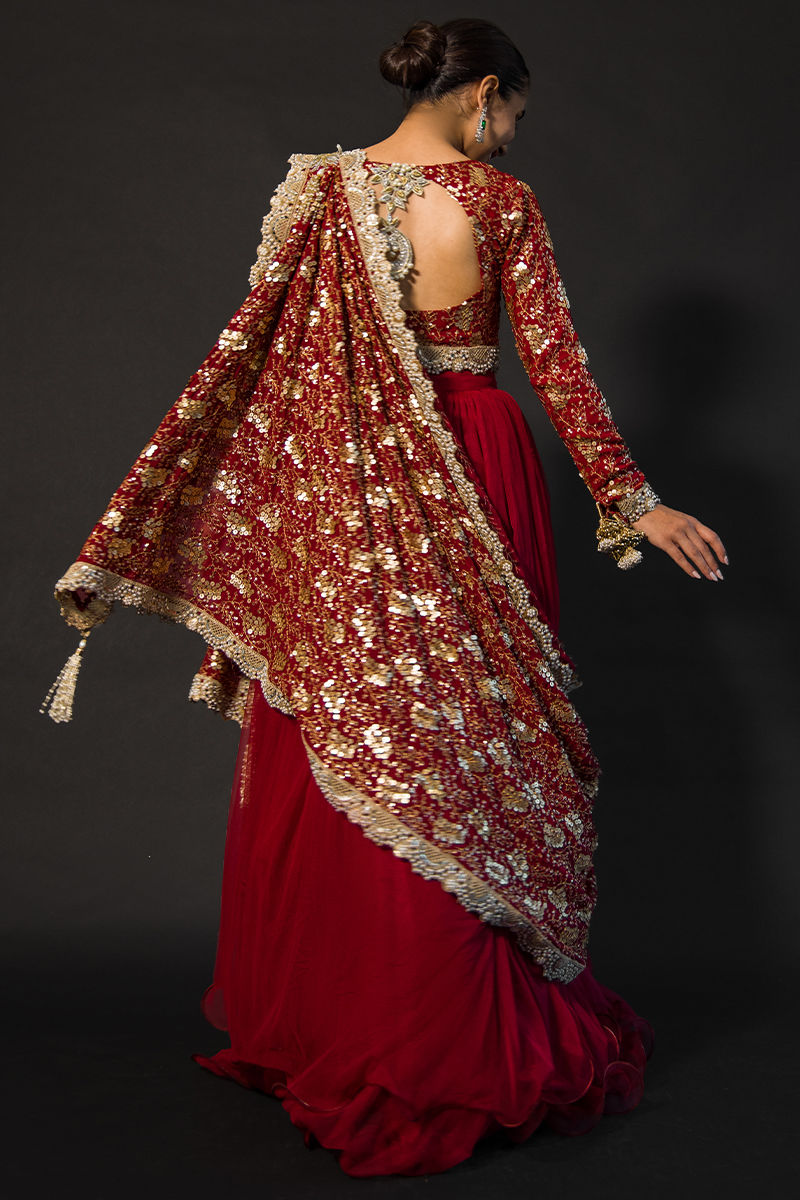 Scarlett a regal net-wired cotton silk attire in a red hue, the choli has sequined and self-embroidery work on it and scalloped borders at the choli hem and sleeves. sleeves are embellished with hand-made tassels paired with intricate dupatta adorned with hand-made tassels and self-embroidery.