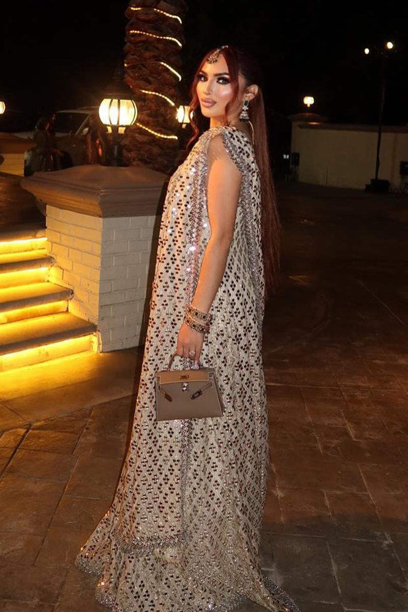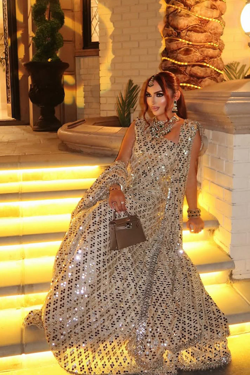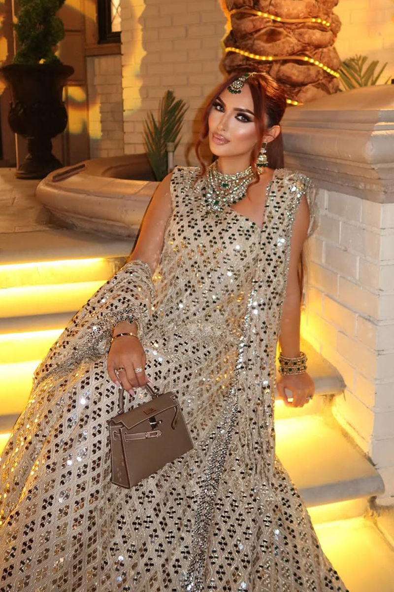 Laleh is a graceful chiffon peshwas adorned with intricate thread zara embroidery and foil work all over, complemented by a mirror-worked border on the damaan and dupatta. The dupatta is attached to the shirt, creating a seamless and elegant silhouette that eInudes sophistication. Peshwas length 59 inches.