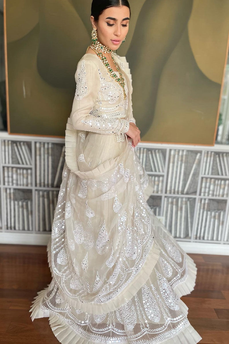 Pure organza with mirror work and self embroidery. A regal lengha choli with crafted and pulled out pleats detailing, with zardozi worked brooches. Pre-drapped dupatta with hand worked zardozi brooches and tassels.