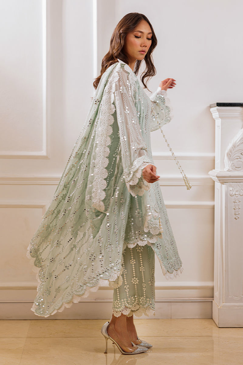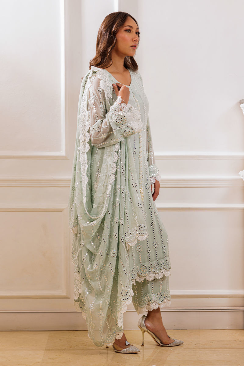 The Shenila green georgette chiffon shirt features foil and thread work, complemented by elegant lace detailing on the daman, sleeves, and pants. The set includes a draped dupatta with scallops and handmade pearl tassels on the neckline, creating a refined, sophisticated look.
