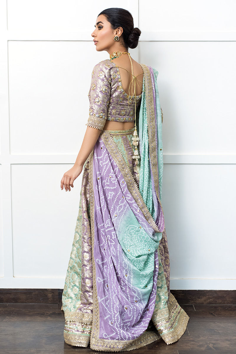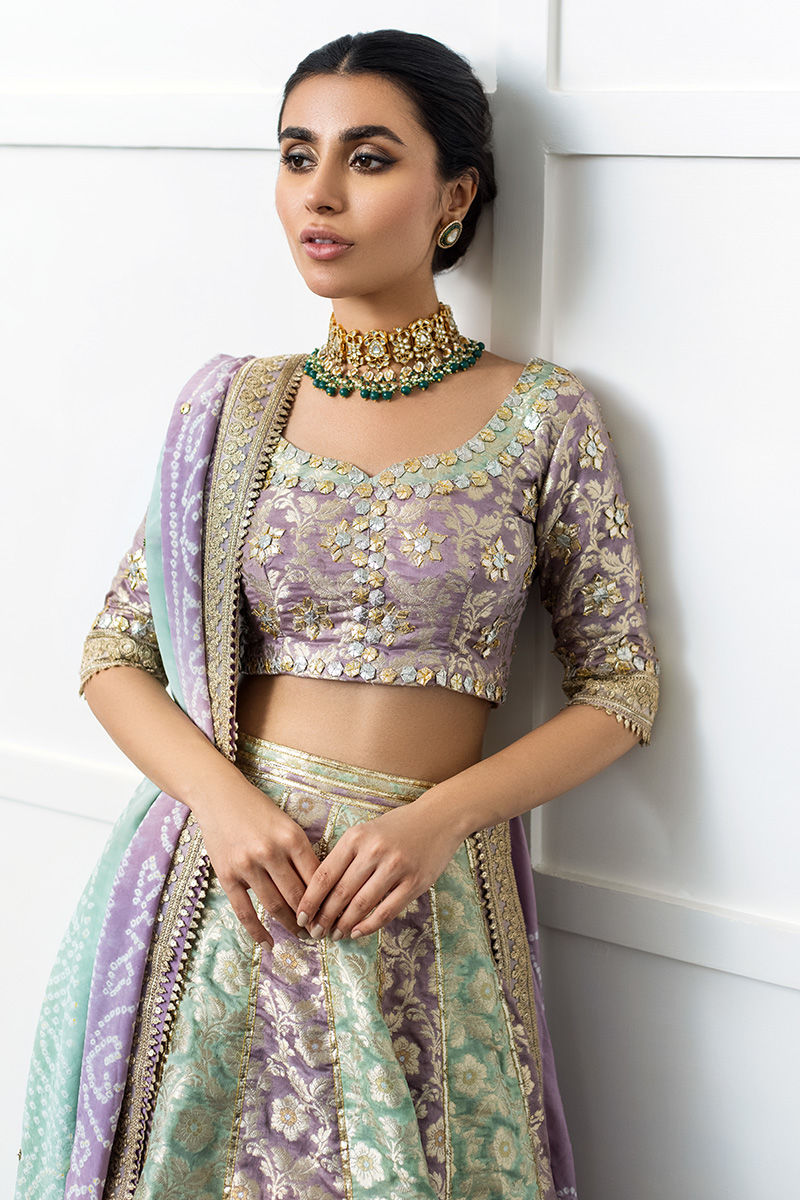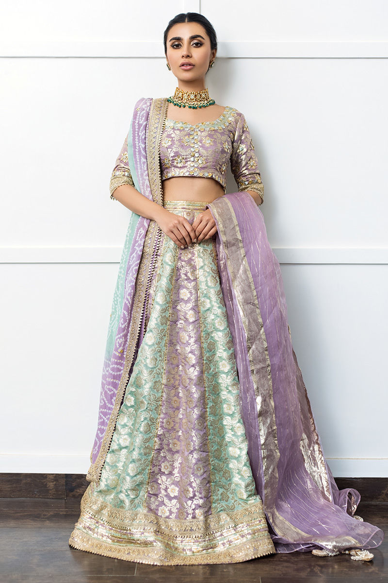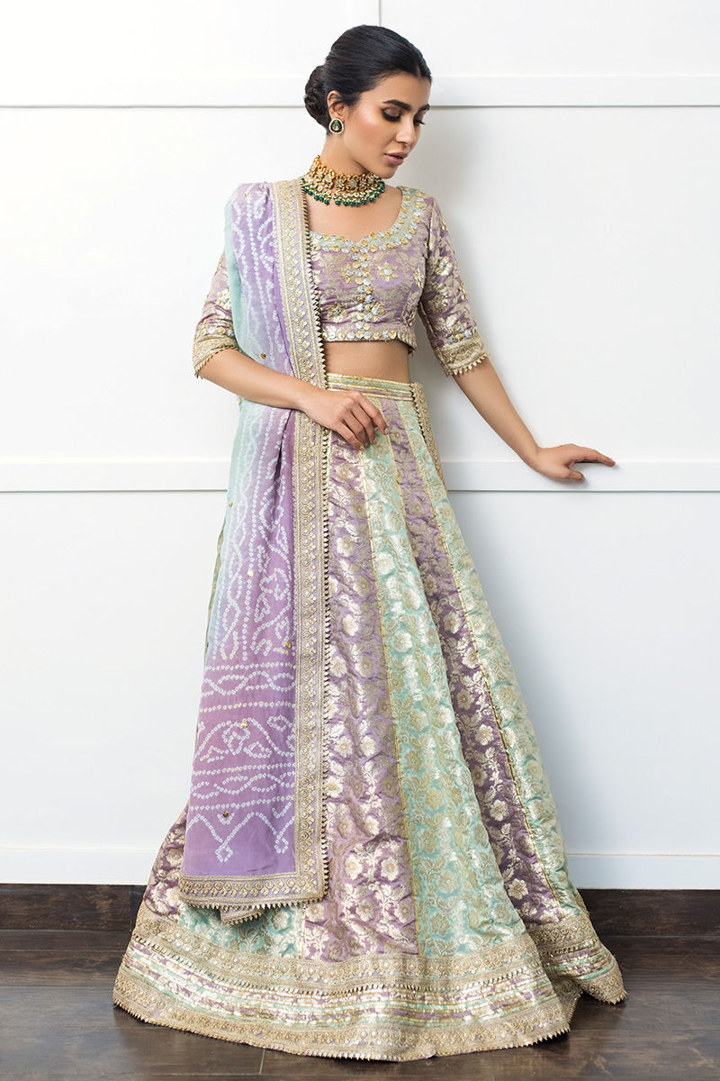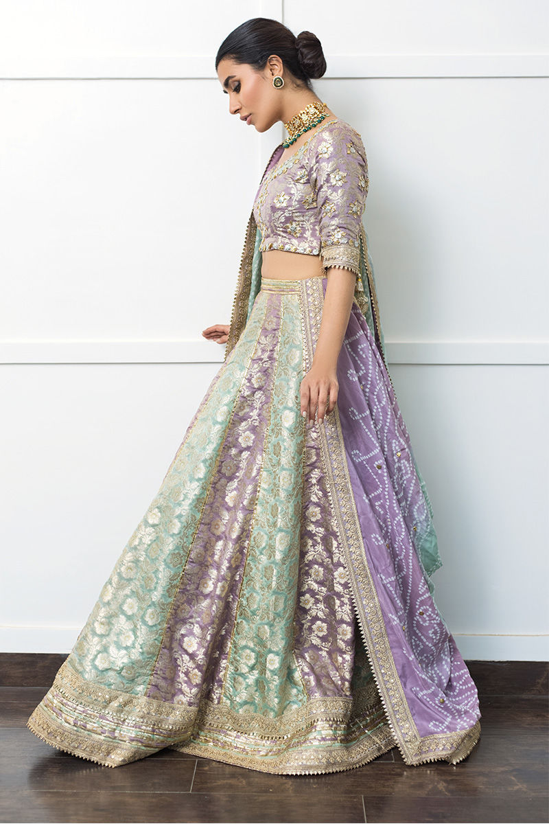 Jamawar colour blocking lengha choli in beautiful shades of lavender, mint green and gold. Accented with gotta work along the choli and intricately gold borders around the lengha, sleeves and chunri dupatta.