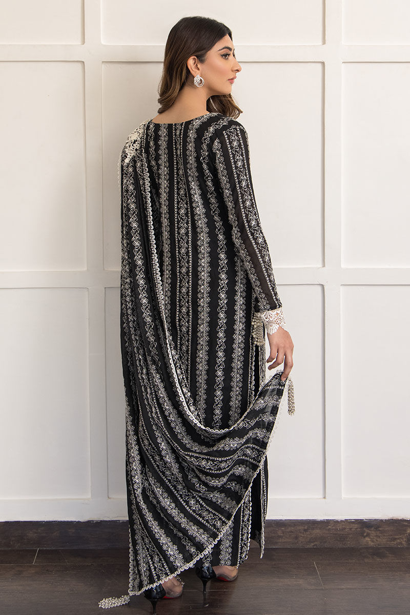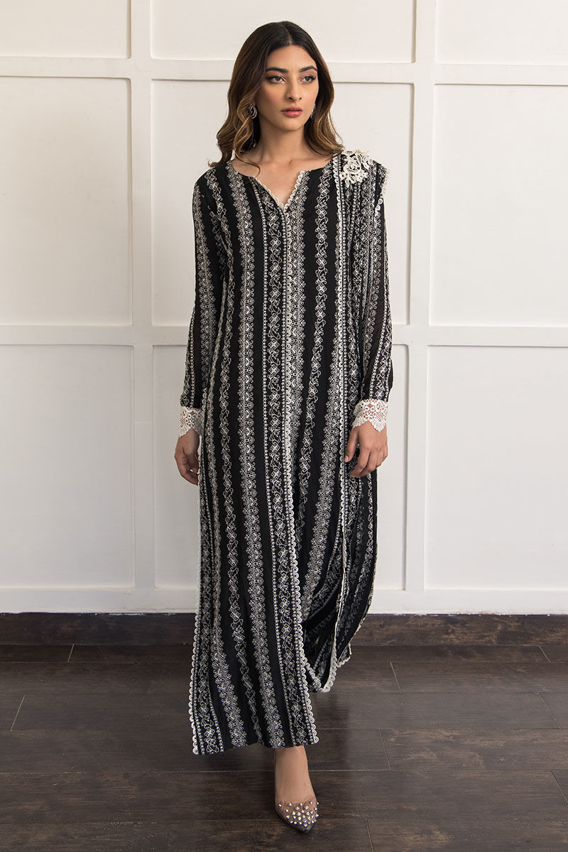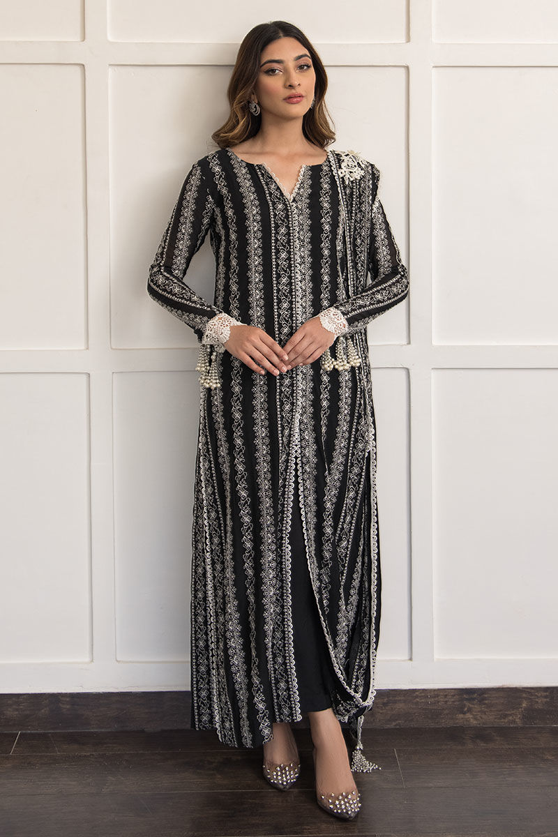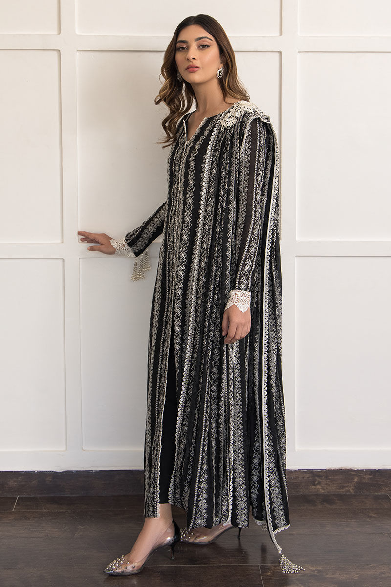 A classic black hue made from pure voil fabric with attached lining, featuring intricate white embroidery and attached pleated dupatta with 3D floral broach. A new take on our coveted Sage design. Paired with cigarette black cotton silk pants.