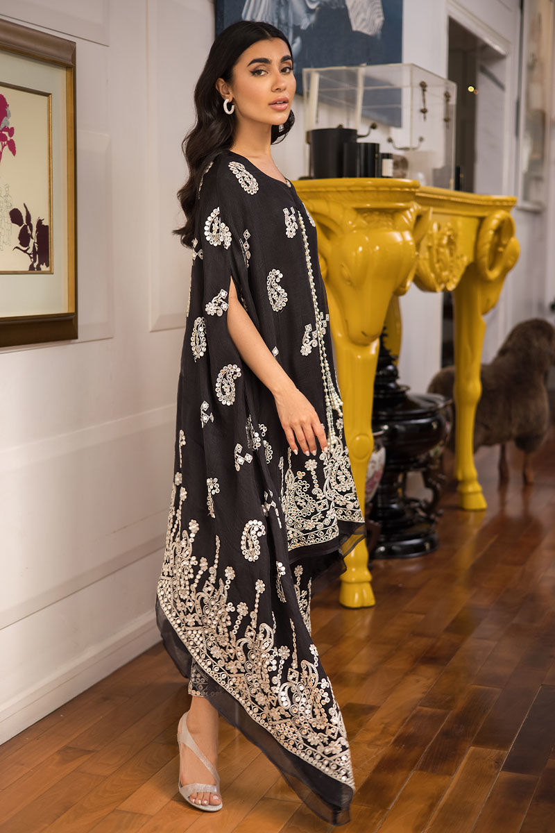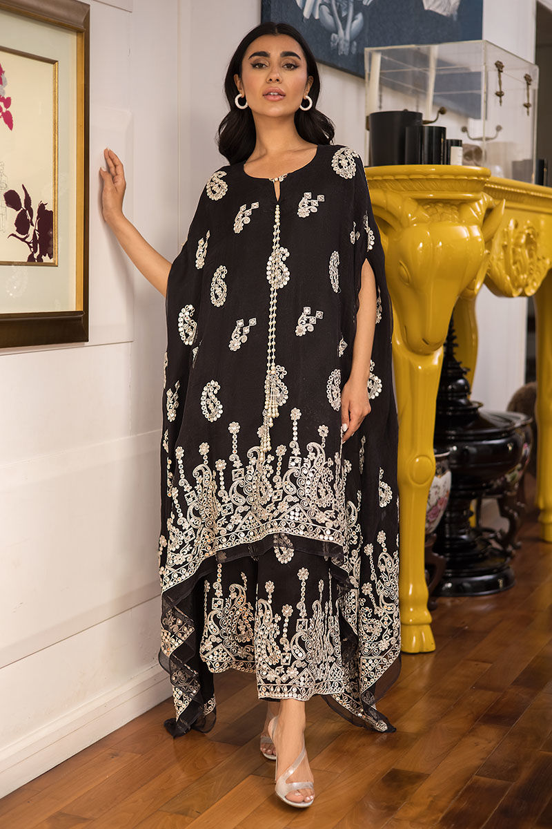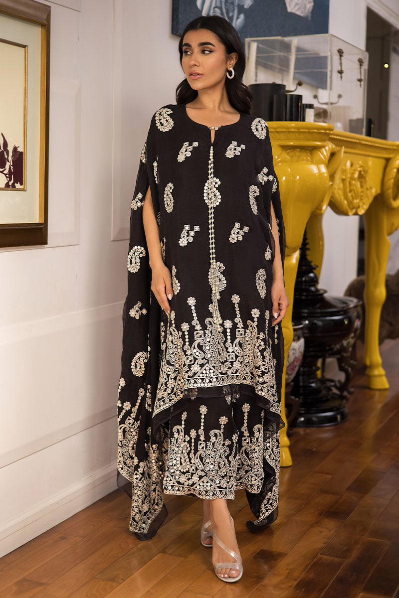 Create a phenomenal look for your most cherished and memorable occasions. Sylvia is a black pure organza cape cut with attached cotton silk lining with thread and mirror foil work all over. Handmade pearl tassels hanging at the neckline with pure organza thread foil mirror work pants. This truly exquisite ensemble is a sure head-turner this festive season.