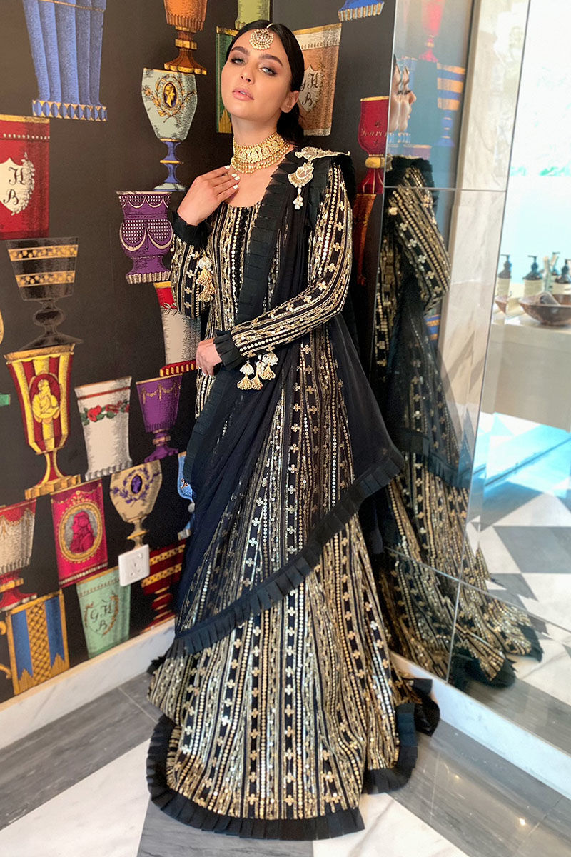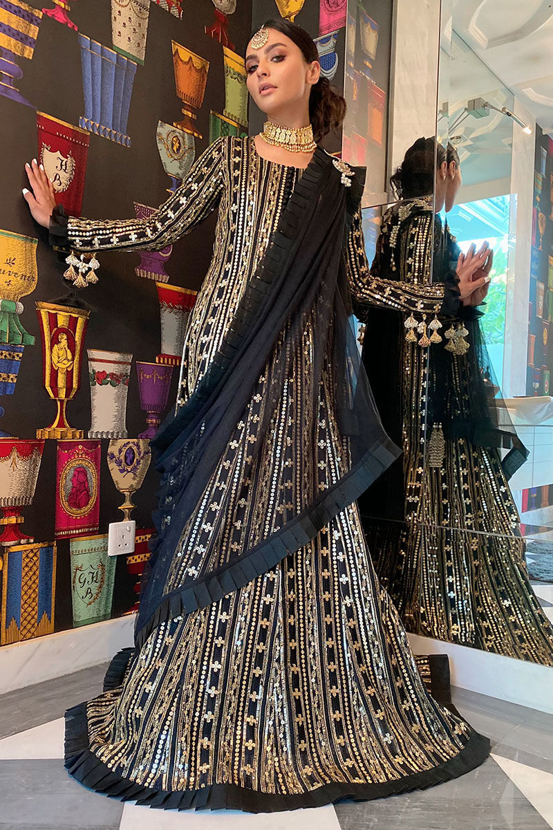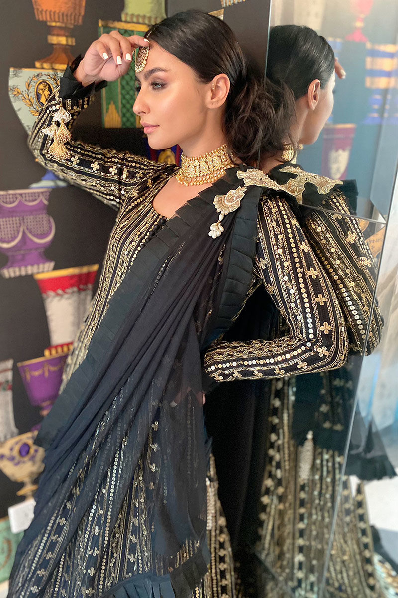 Dazzle in our timeless black and gold peshwas featuring intricately hand-worked zardozi worked brooches, statement tassels and pleated details. Paired with drapped dupatta with pleats and hand worked brooches.