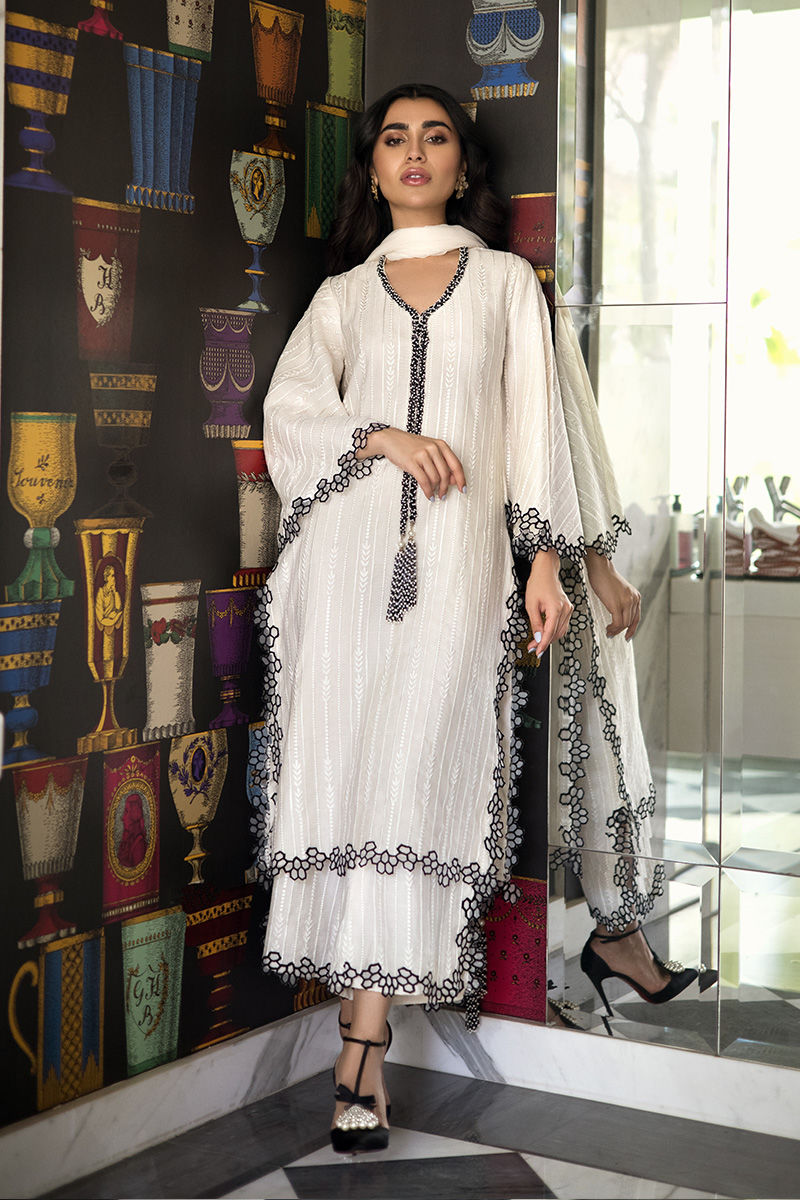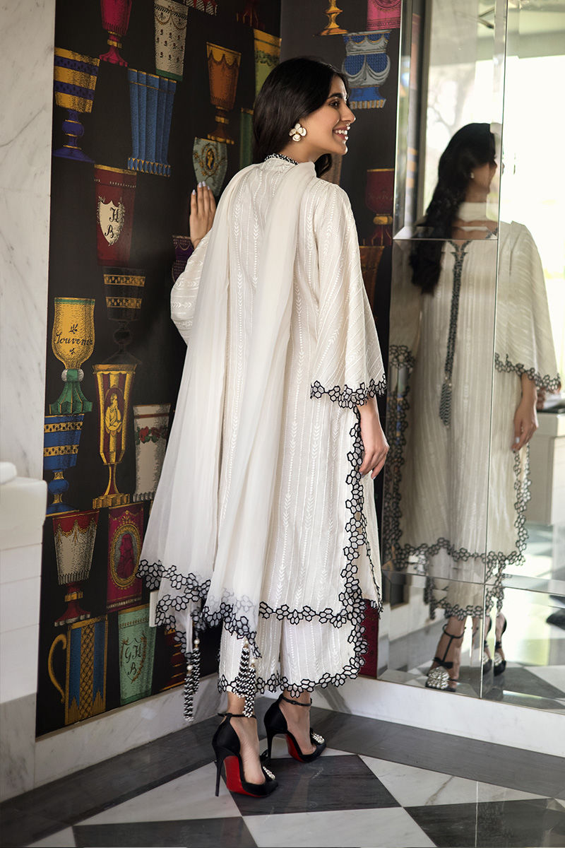 Tulip features a pure cotton net shirt with self thread work and embellished neckline, with appliqued borders on the sleeves, damaan and pants with attached cotton silk lining. Pared with a timeless chiffon duppata with appliqued borders and handmade pearl and cut dana danglings.