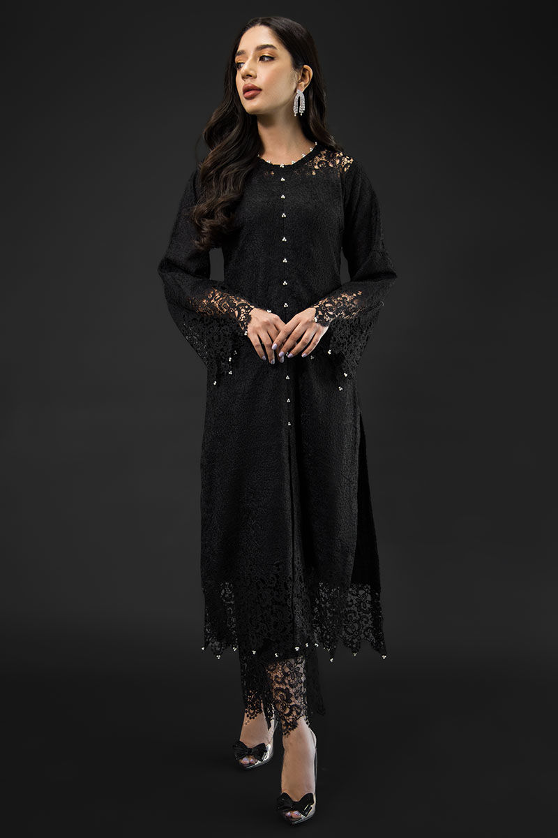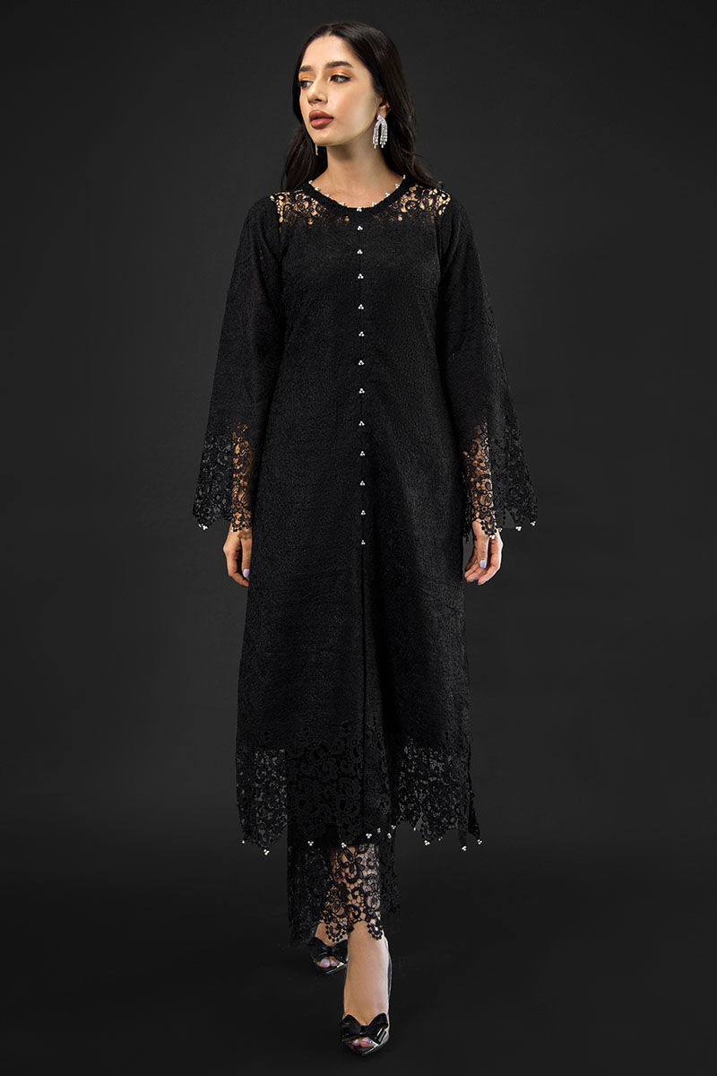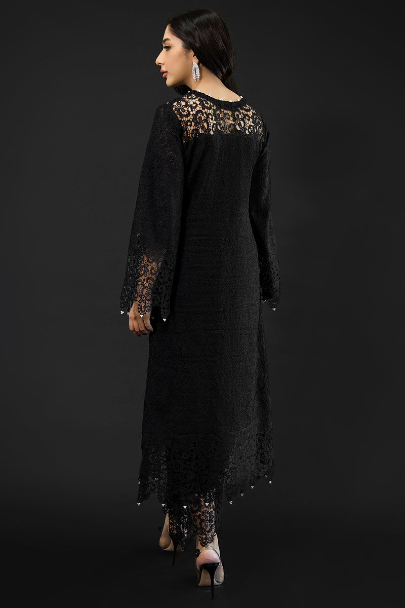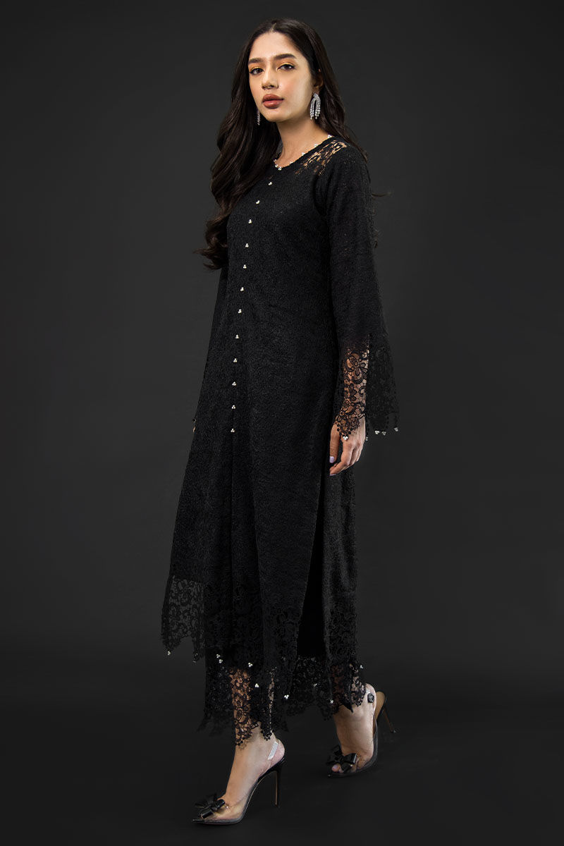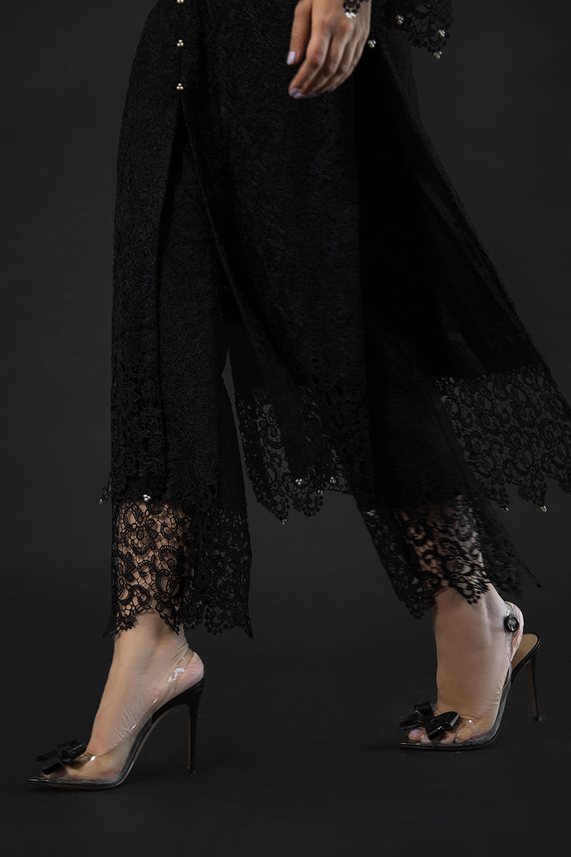 Willow is an epitome of beauty, a black-hued intricate ensemble, attire is made from jute fabric with cotton silk lining, with attention to detail, this diaphanous dress is embellished, detailed with pearl and 3D applique cutwork on the daman, sleeves, and Neckline and the trouser.