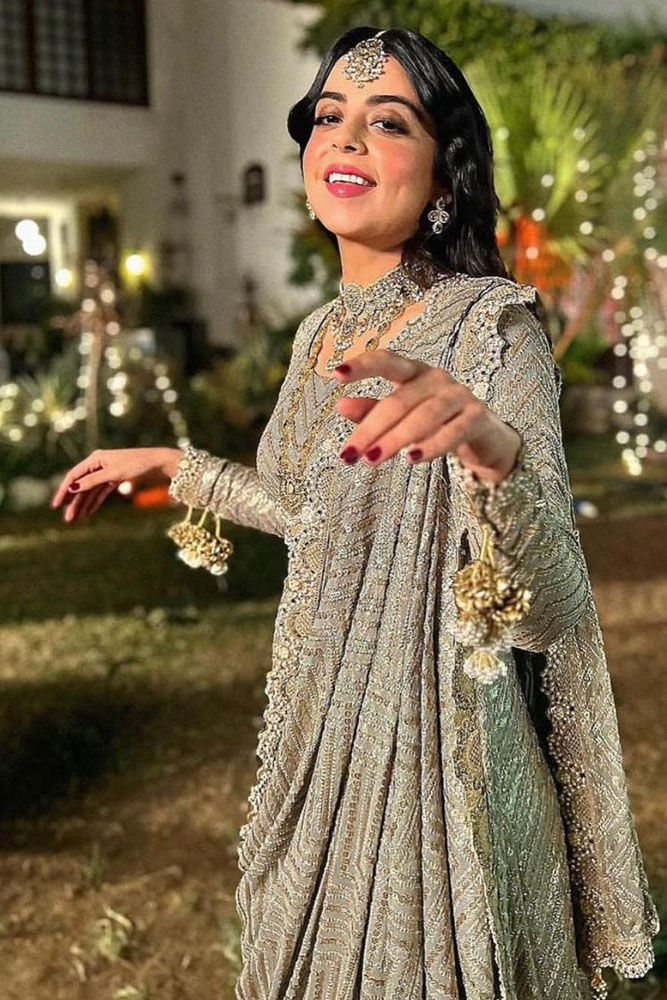 Stunning ensemble with self embroidery and sequins work all over. The lehnga, dupatta the dupatta feature beautiful hand worked scalloped borders, with a handmade zardozi brooch at the back of the neckline. The scalloped worked border on dupatta accentuates the look. * Dupatta can’t be sold separately.