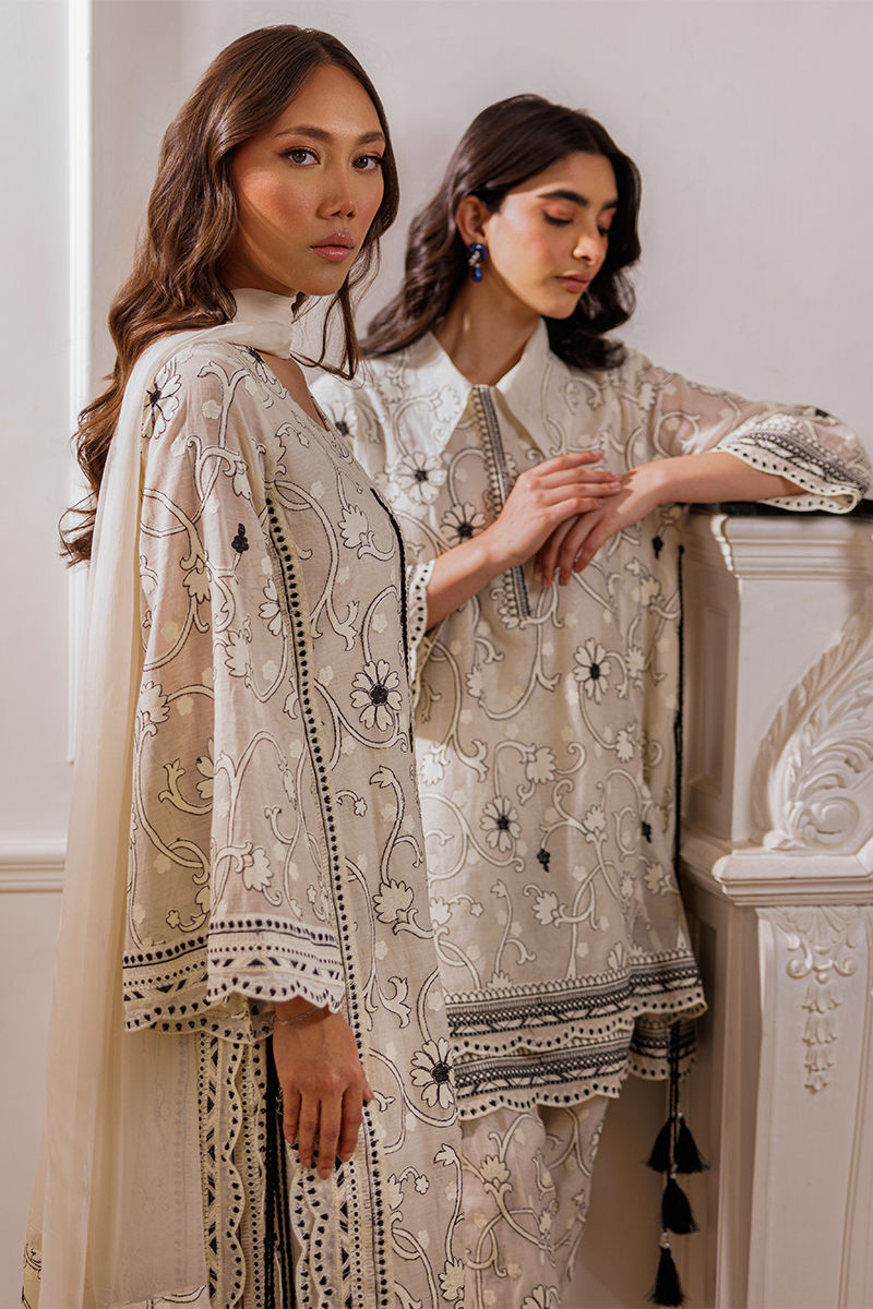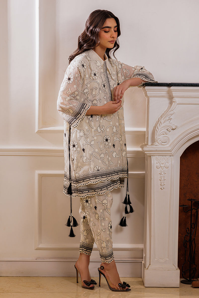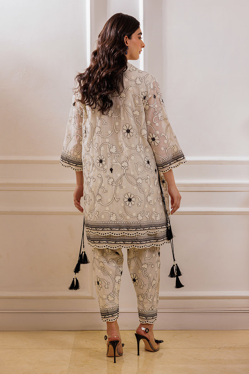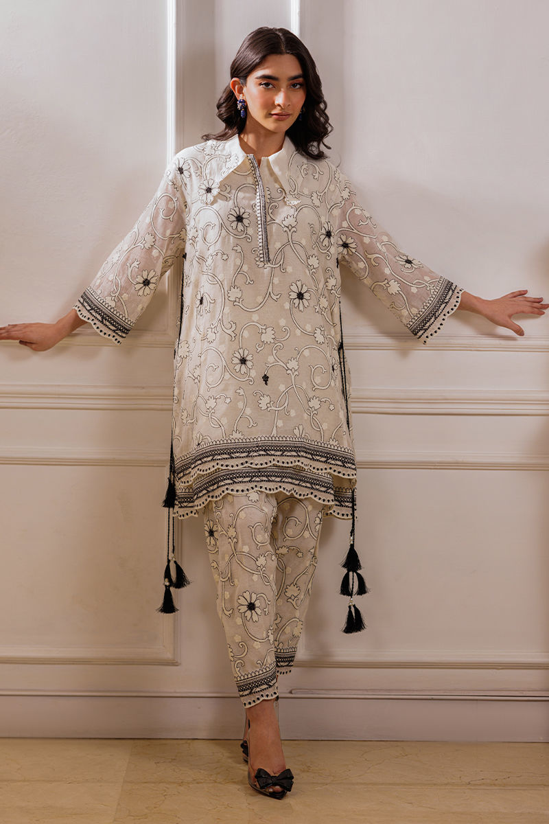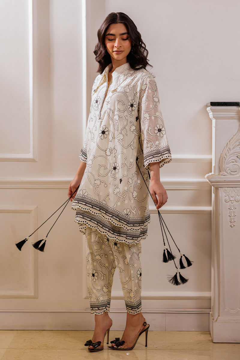 The ensemble features a pure cotton voile short shirt adorned with intricate thread embroidery and cutwork detailing throughout. A delicate floral cutwork collar with handmade thread tassels and pearl accents enhances the design. The outfit is paired with a classic shalwar, creating an effortlessly elegant look. A slip, longer than the shirt, is included, featuring an embroidered border and scalloped edges for a refined finish.
