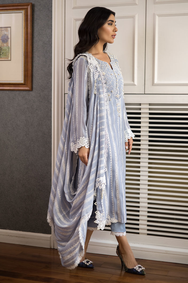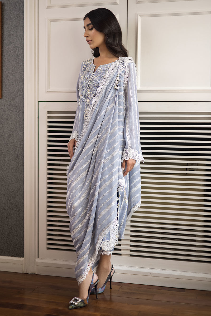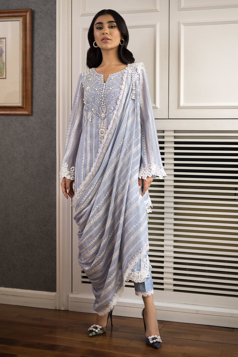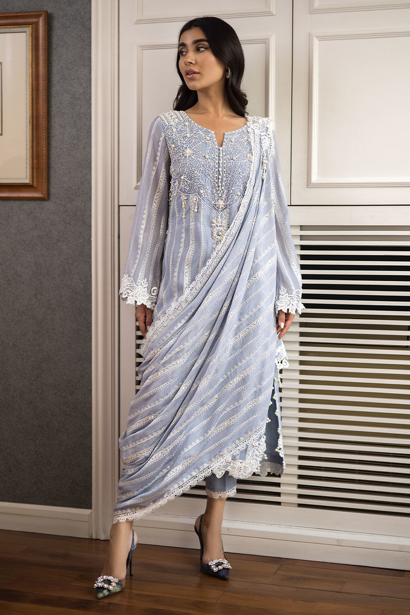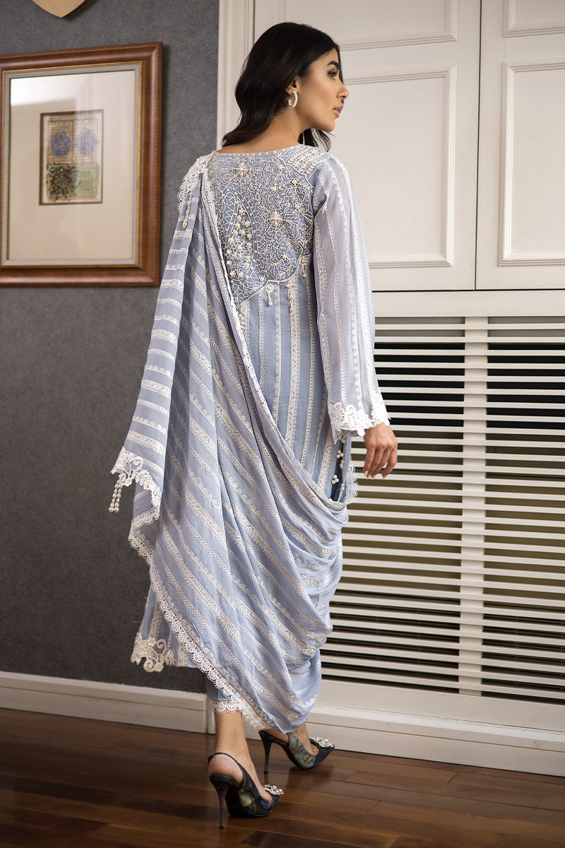 Look fabulous in this stunning “Zaraar”. A pure voil fabric with thread work embroidery on the voil with thread work embroidery on the neckline in front and back with handmade pearl embellishments on it with 3D broach on the damaan and pearls on the slits with draped Duppatta not attached to the shirt with a 3D floral broach on it.