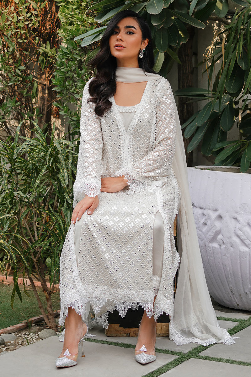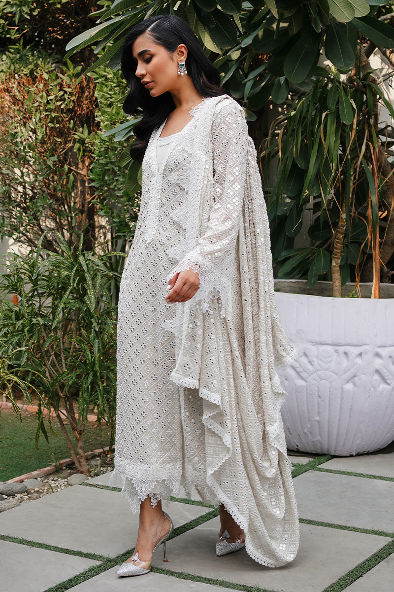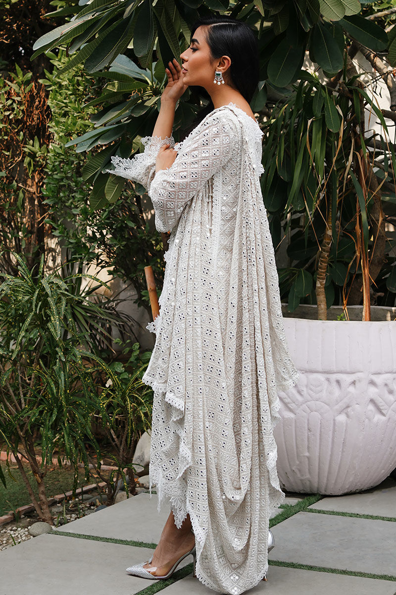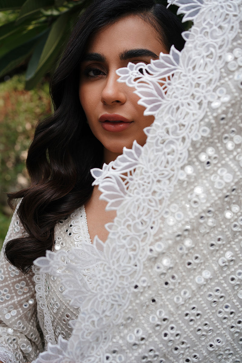 Elegance in every detail: Ivory georgette chiffon fabric adorned with foil and thread bootis, complemented by loop lace on neckline slits and front panels. Delicate floral cutwork lace embellishments and a charming chalks dori with pearls tassel elevate the look, while a longer inner with cutwork lace at the damaan adds a touch of sophistication."
