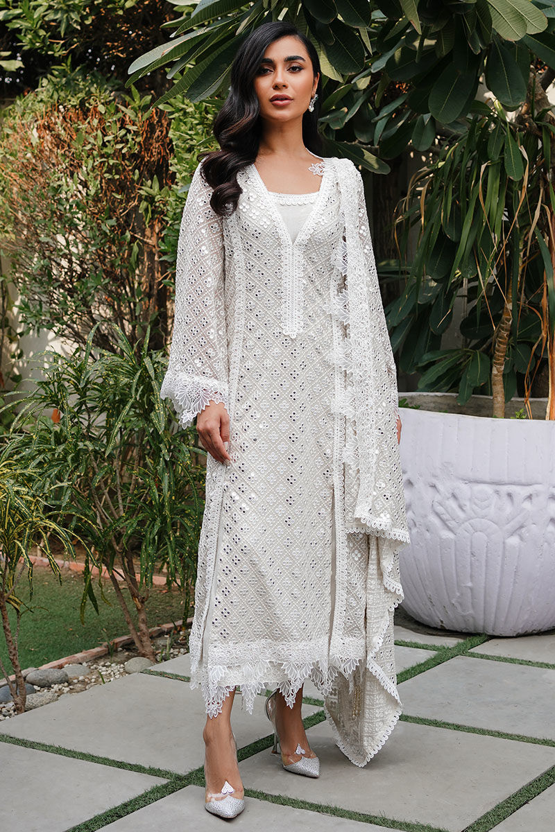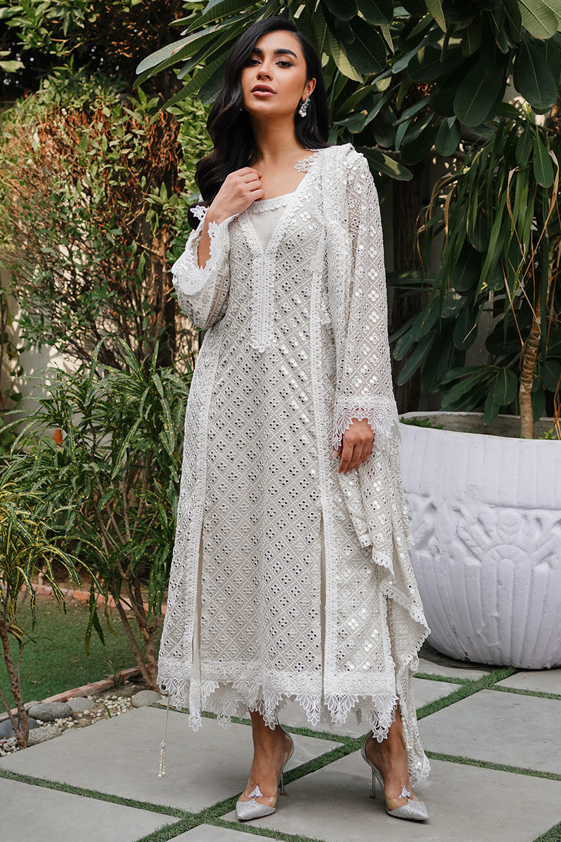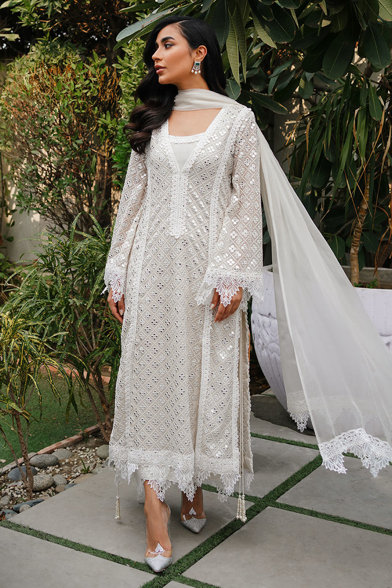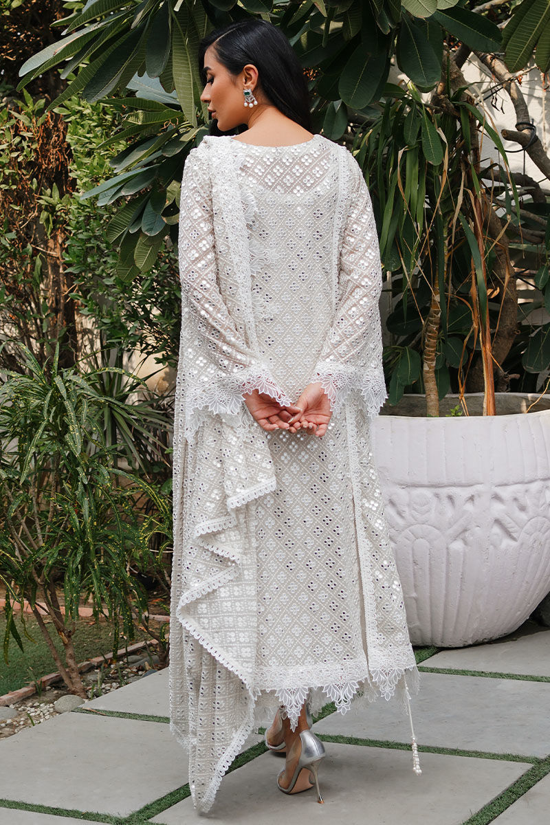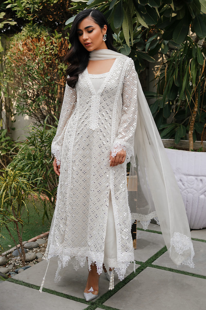 Elegance in every detail: Ivory georgette chiffon fabric adorned with foil and thread bootis, complemented by loop lace on neckline slits and front panels. Delicate floral cutwork lace embellishments and a charming chalks dori with pearls tassel elevate the look, while a longer inner with cutwork lace at the damaan adds a touch of sophistication."